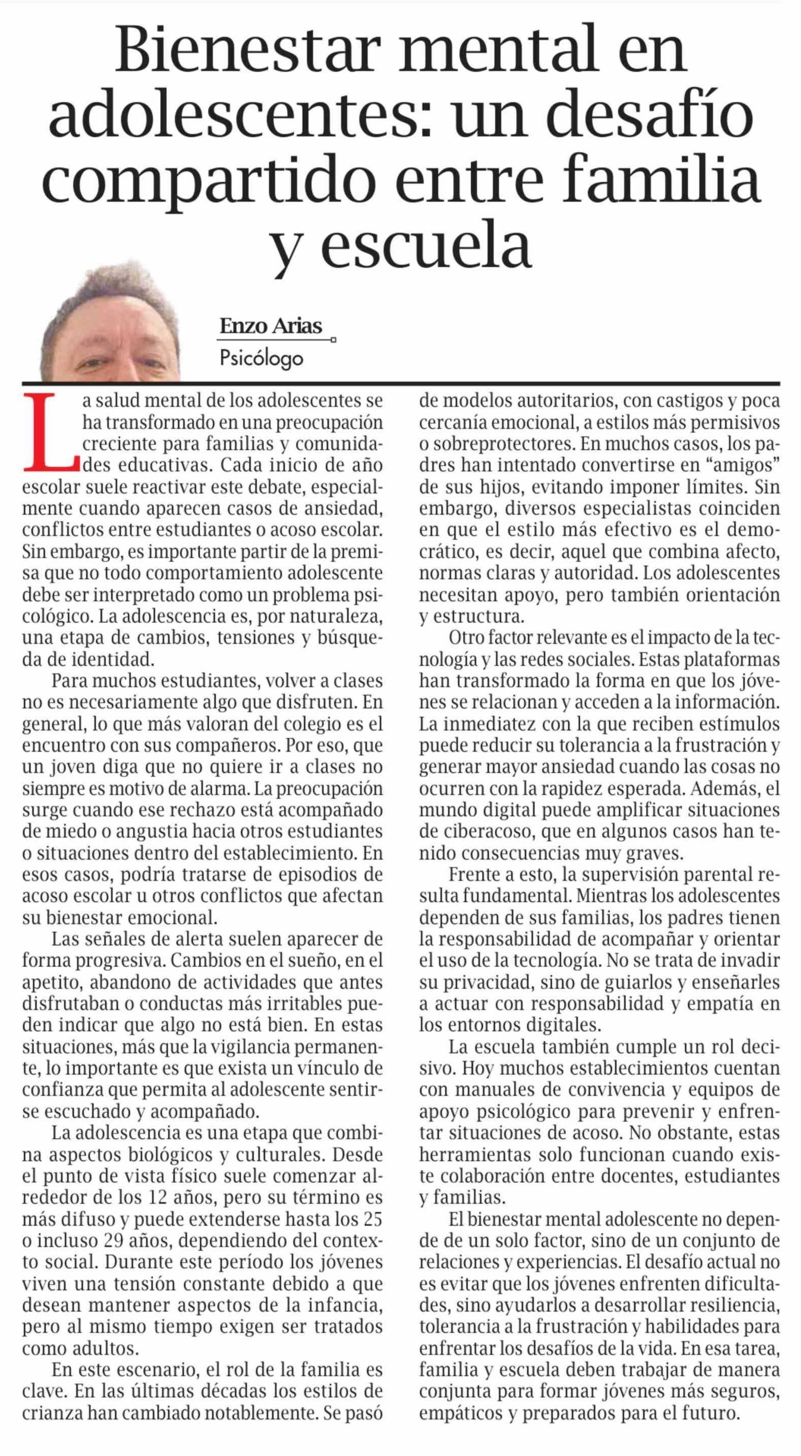 Columnas de Opinión: Bienestar mental en adolescentes: un desafío compartido entre familia y escuela 15-03-2026 El Pingüino |