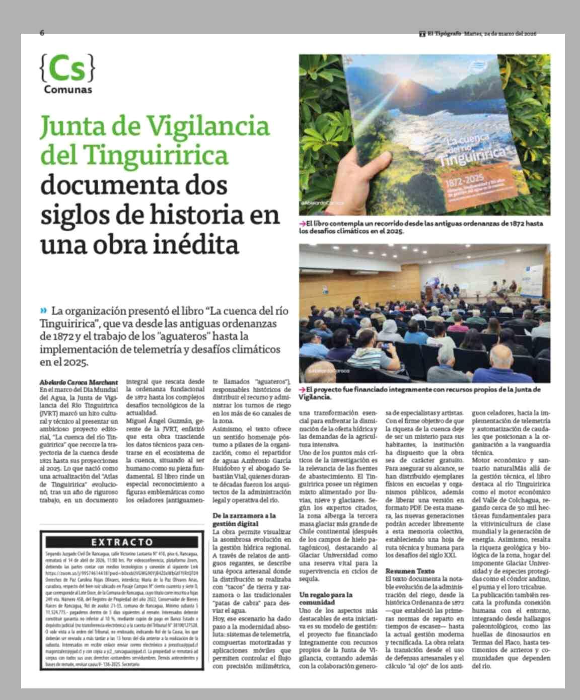 Título: Junta de Vigilancia del Tinguiririca documenta dos siglos de historia en una obra inédita
