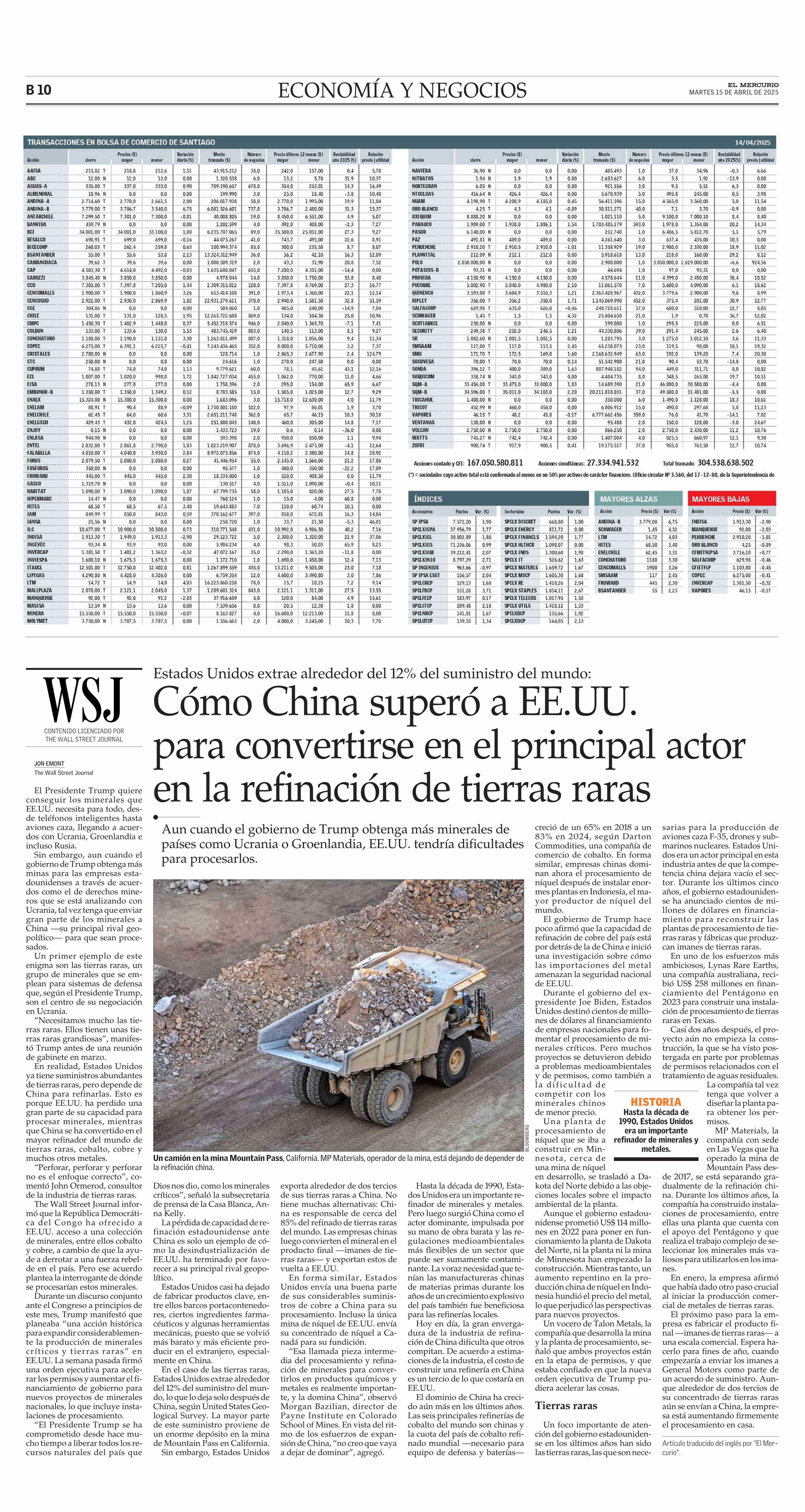 Cómo China superó a EE.UU. para convertirse en el principal actor en la refinación de tierras raras 15-04-2025 El Mercurio |
