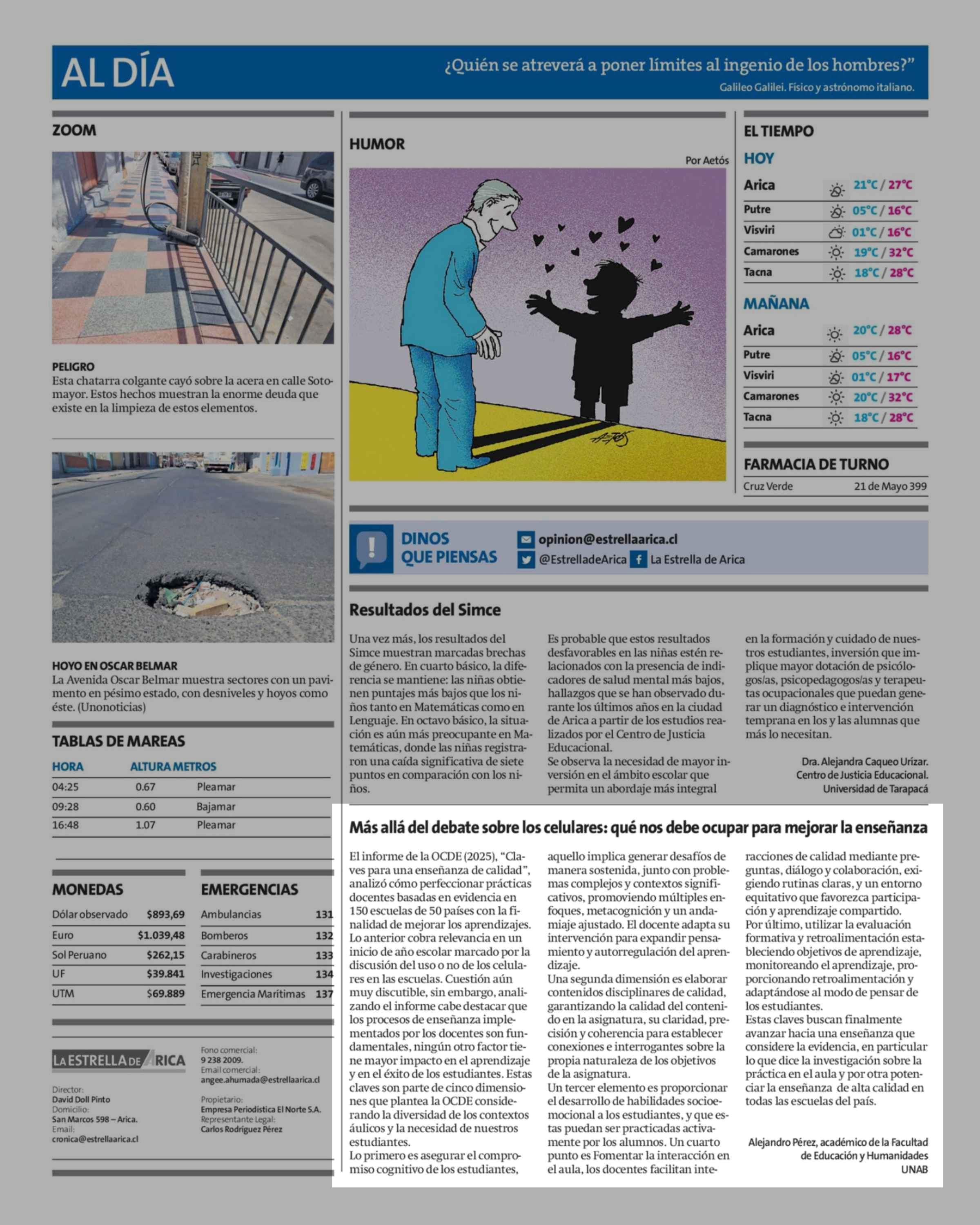 Columnas de Opinión: Más allá del debate sobre los celulares: qué nos debe ocupar para mejorar la enseñanza 12-03-2026 La Estrella de Arica |