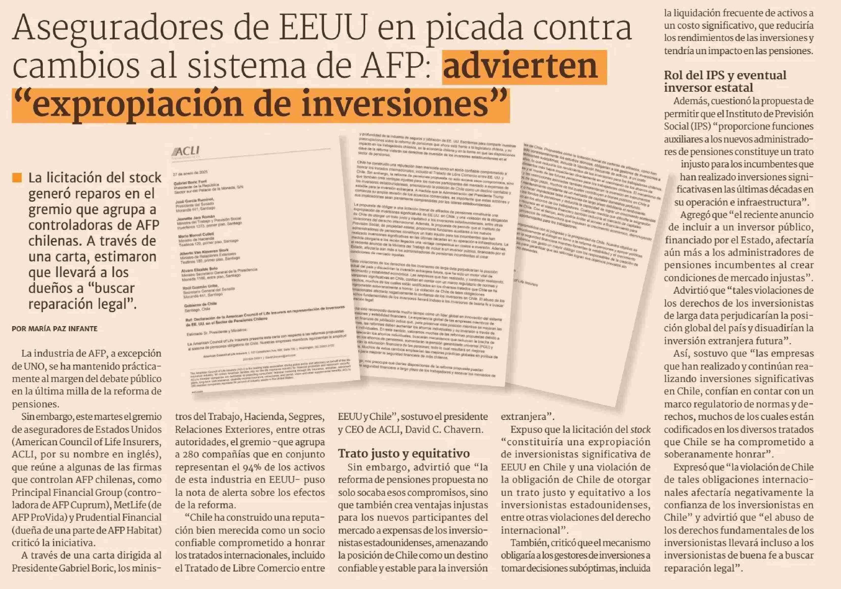 Aseguradores de EEUU en picada contra cambios al sistema de AFP: advierten "expropiación de inversiones" 29-01-2025 Diario Financiero |