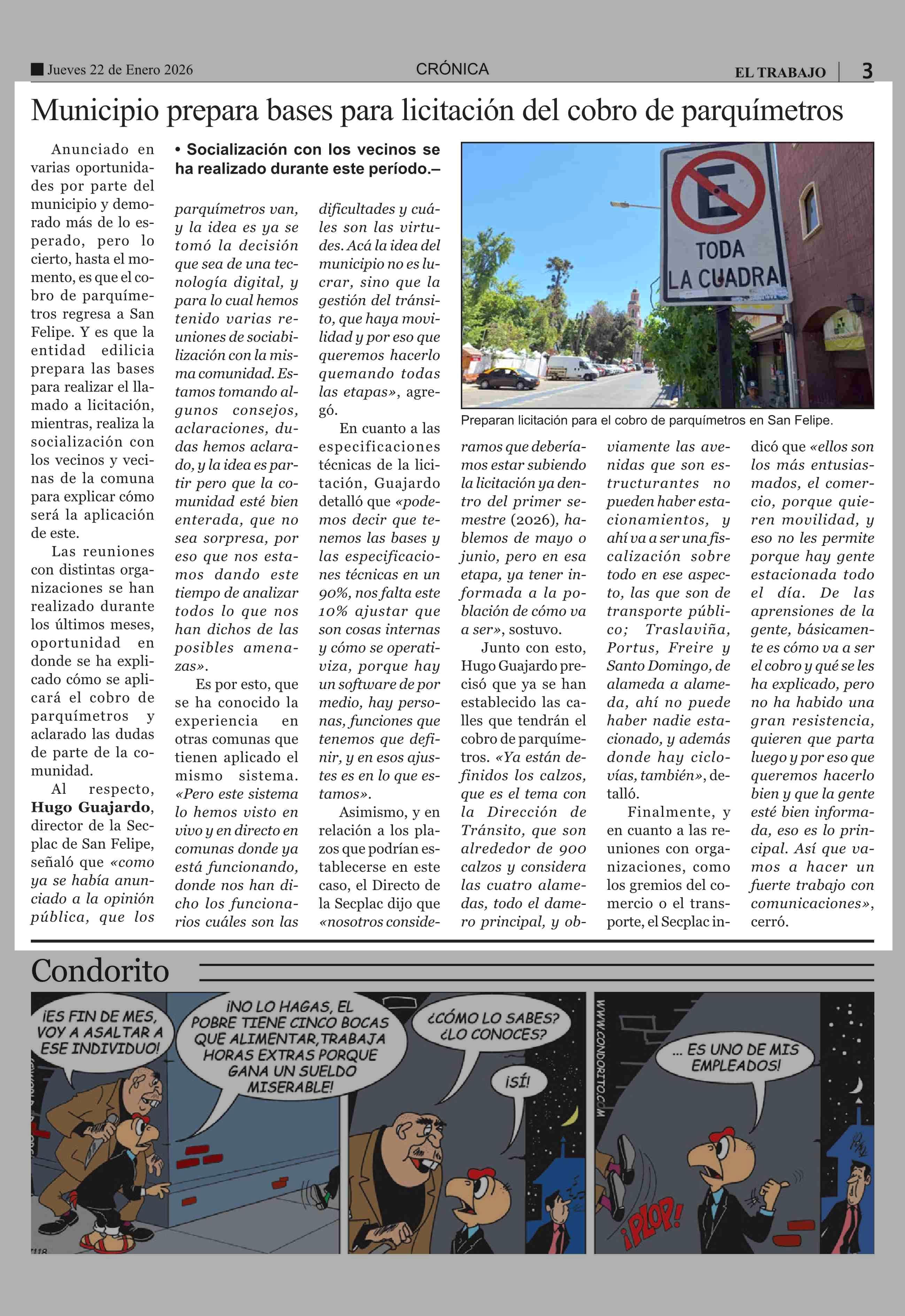 Municipio prepara bases para licitación del cobro de parquímetros 22-01-2026 El Trabajo |