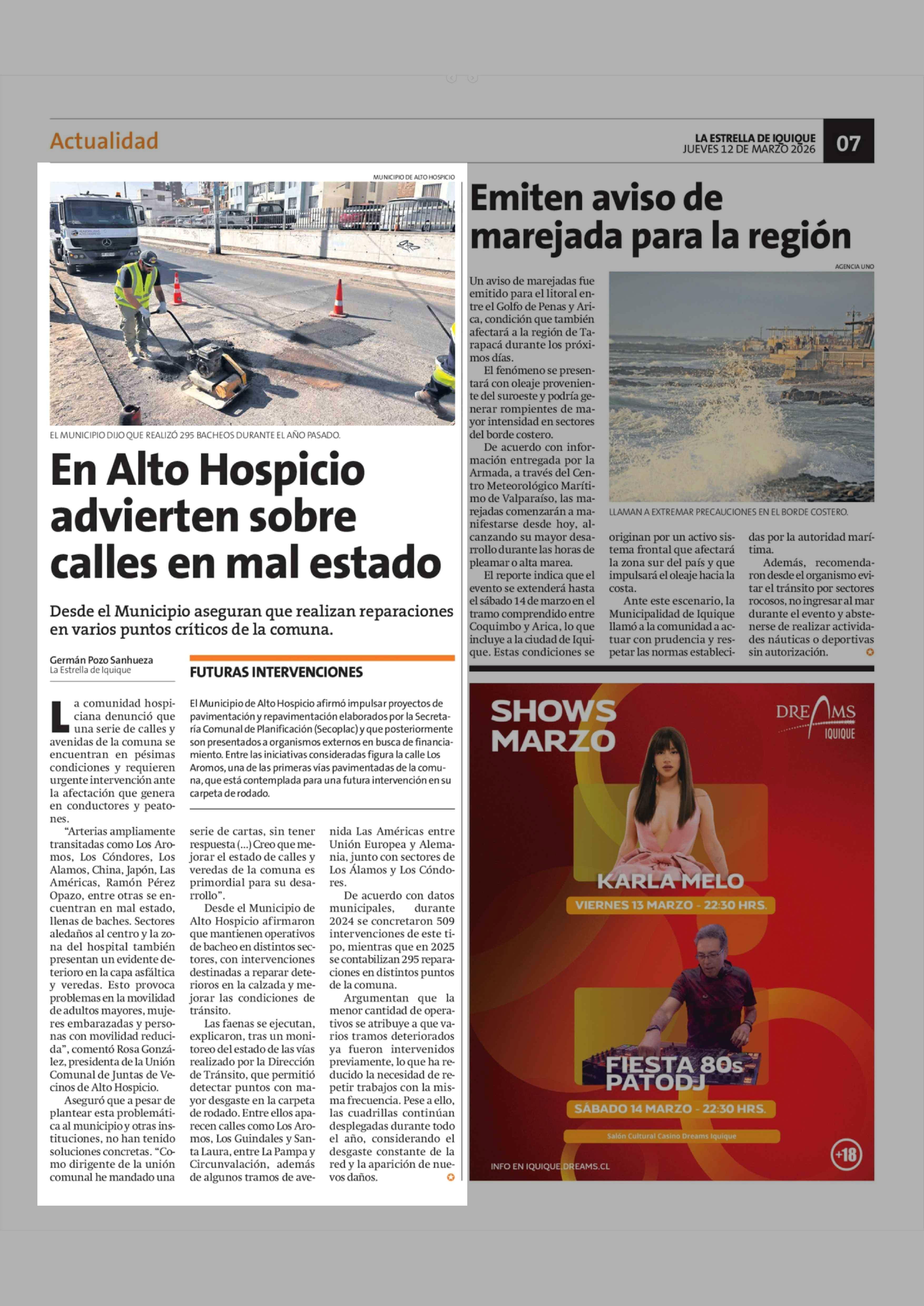 En Alto Hospicio advierten sobre calles en mal estado 12-03-2026 La Estrella de Iquique |