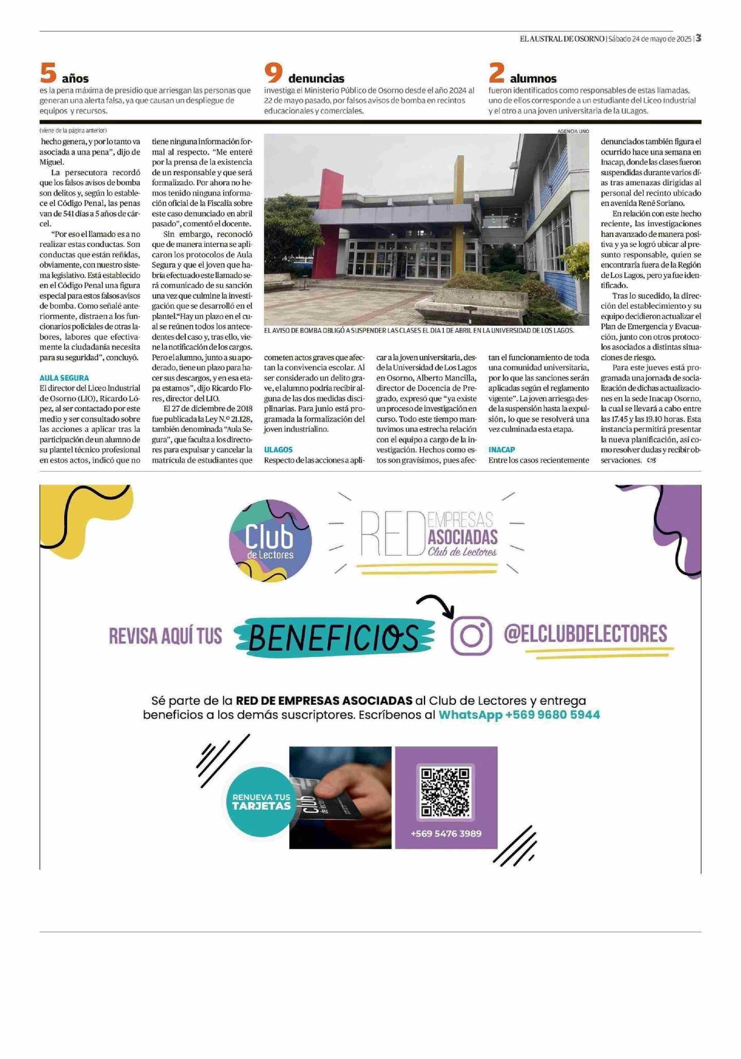 Formalizarán a dos estudiantes acusados por avisos de bomba 24-05-2025 El Austral de Osorno |