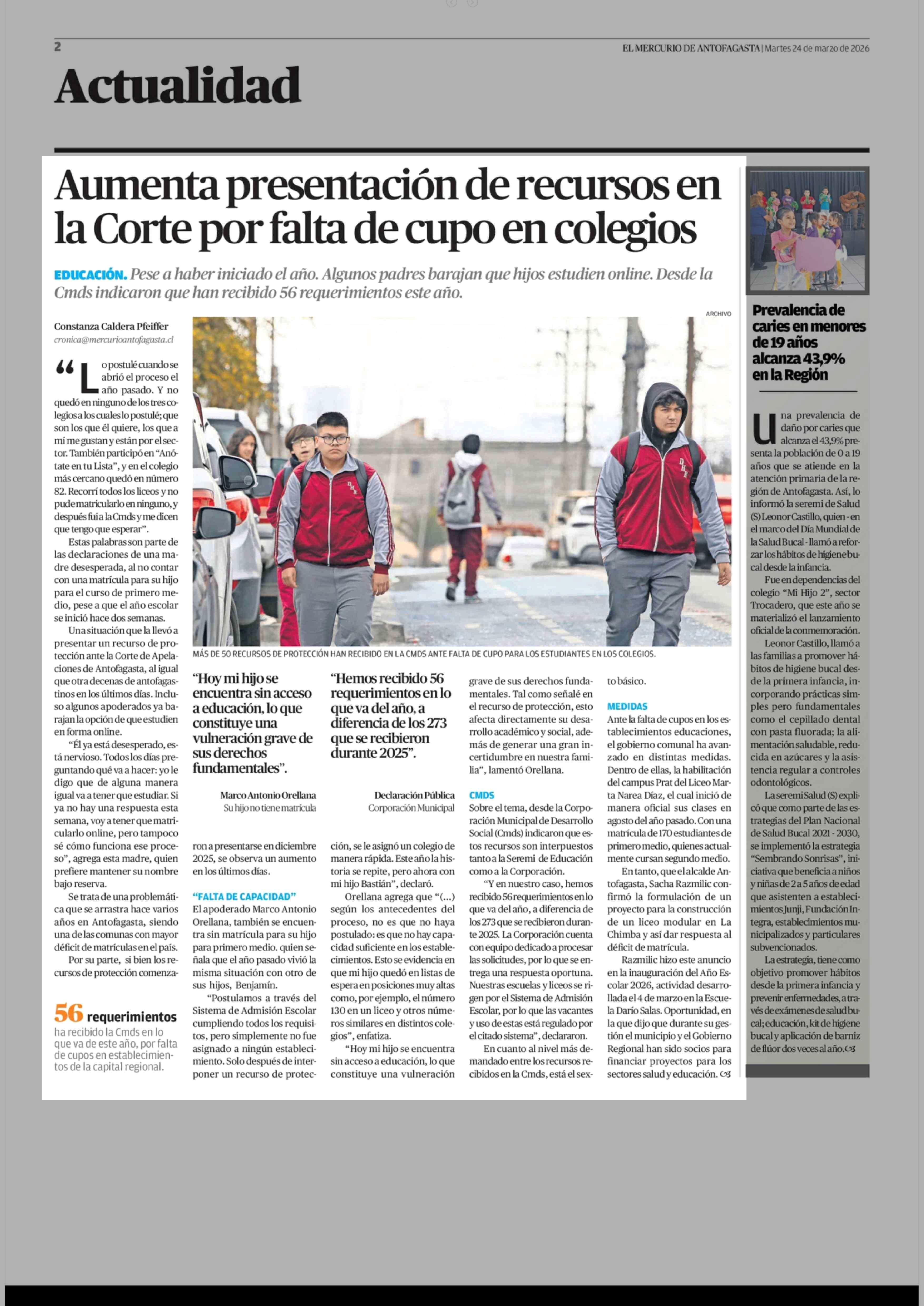 Aumenta presentación de recursos en la Corte por falta de cupo en colegios 24-03-2026 El Mercurio de Antofagasta |