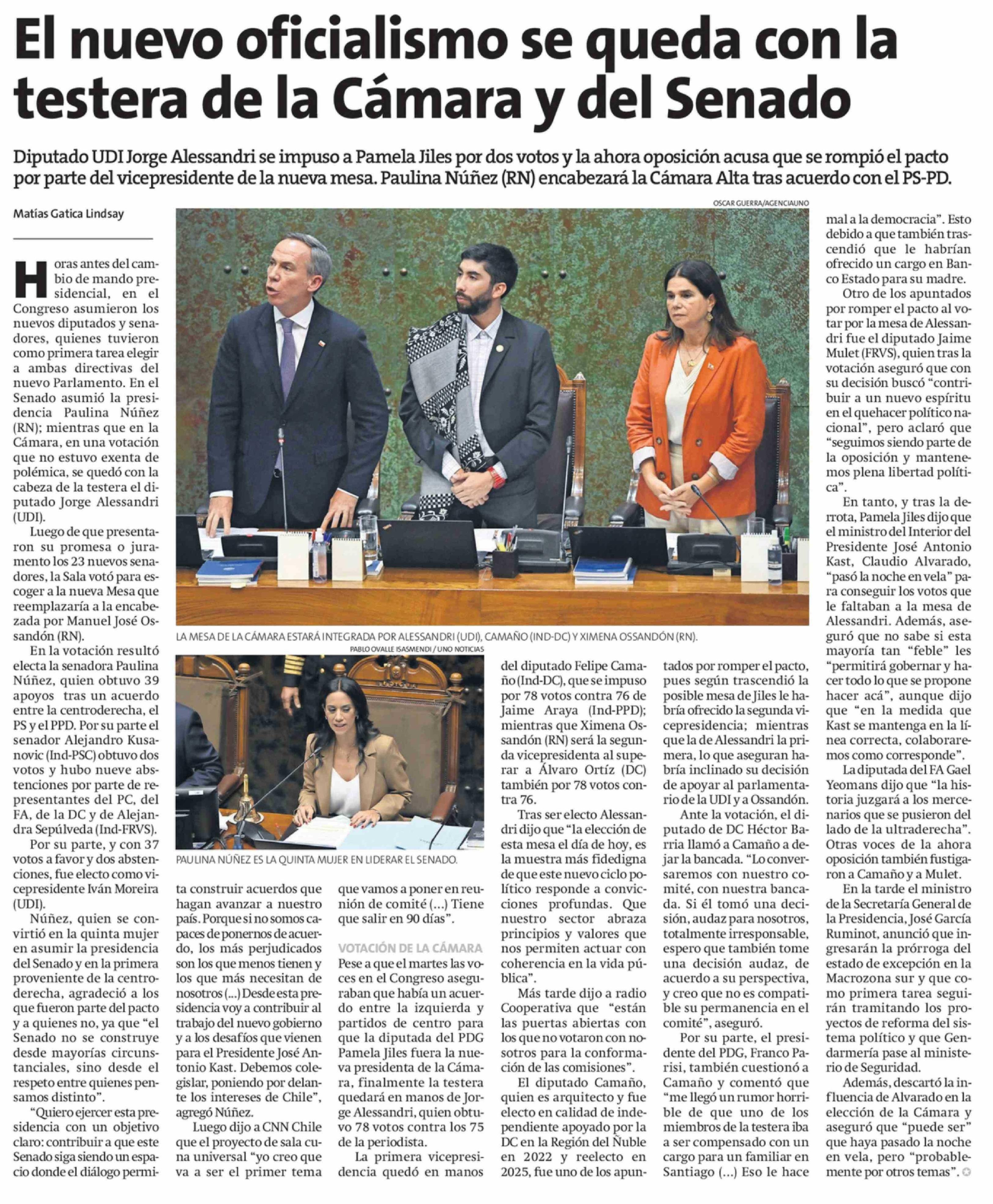 El nuevo oficialismo se queda con la testera de la Cámara y del Senado 12-03-2026 La Estrella de Iquique |