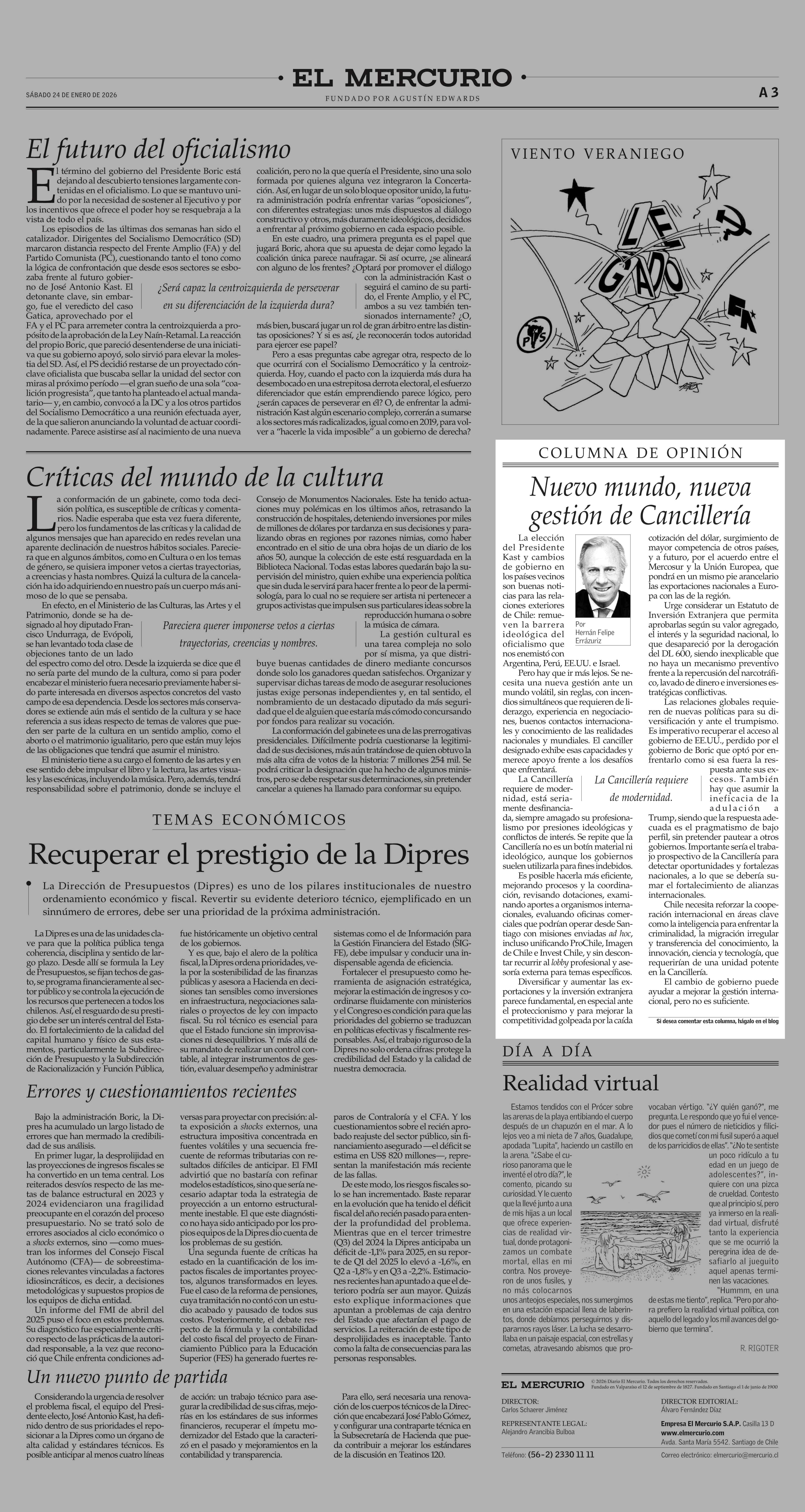 Columnas de Opinión: Nuevo mundo, nueva gestión de Cancillería 24-01-2026 El Mercurio |
