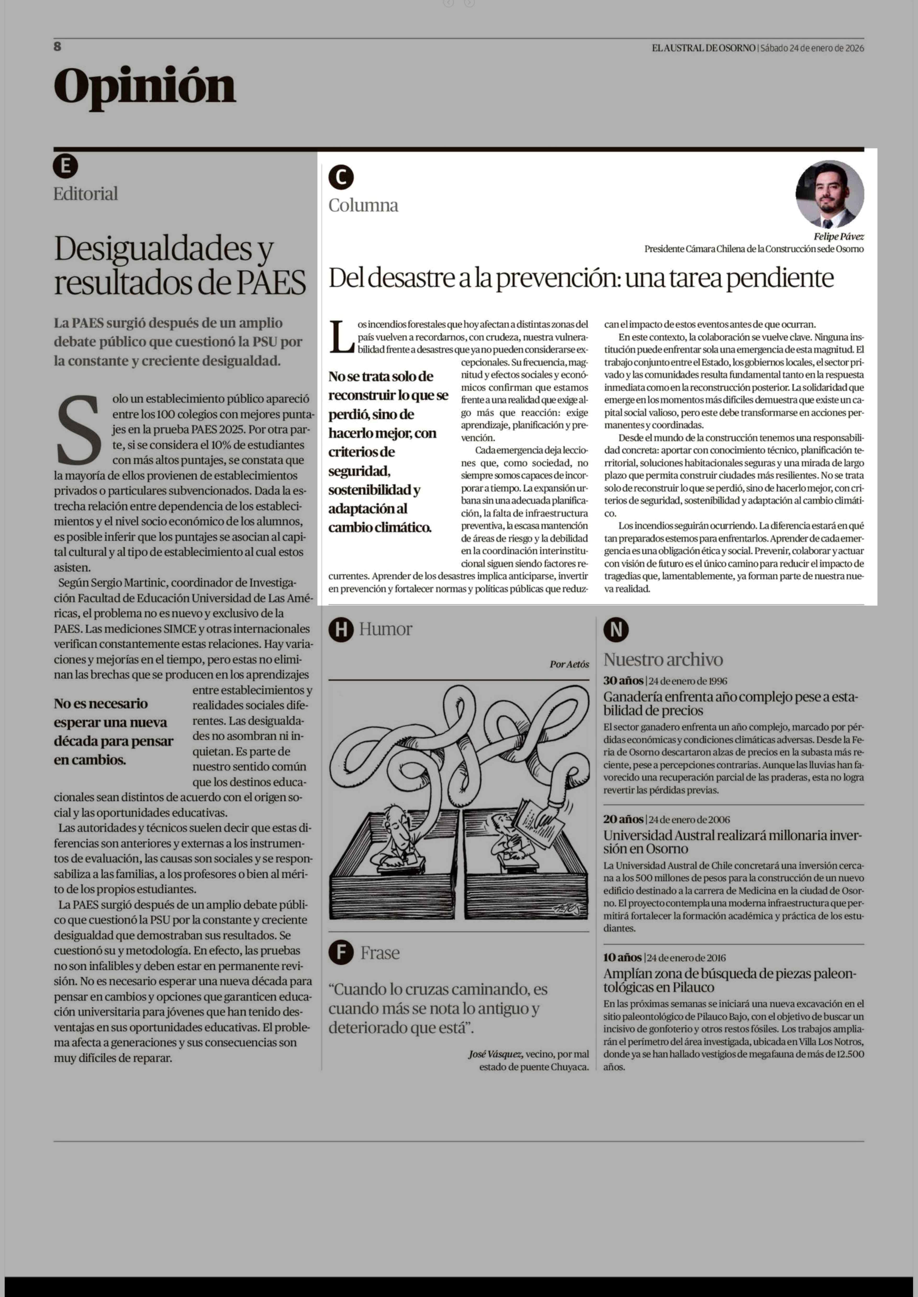 Columnas de Opinión: Del desastre a la prevención: una tarea pendiente 24-01-2026 El Austral de Osorno |