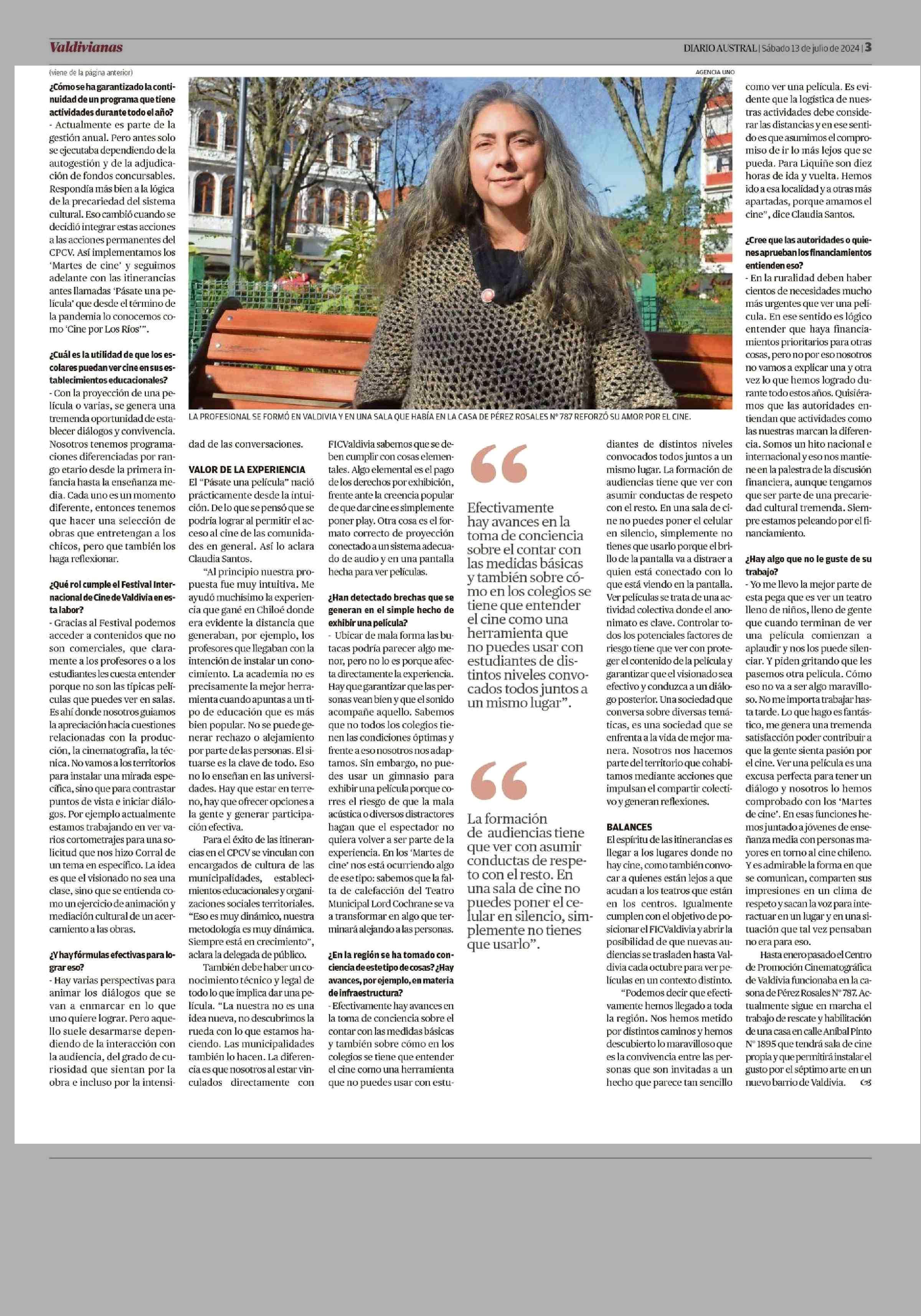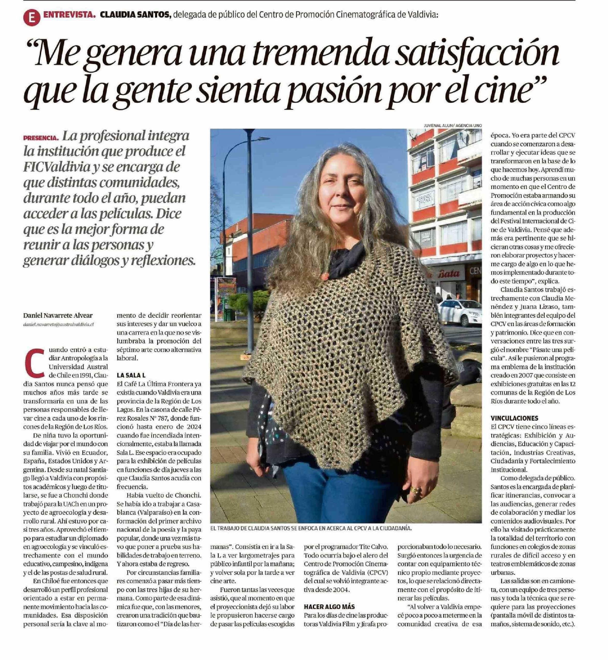 "Me genera una tremenda satisfacción que la gente sienta pasión por el cine" 13-07-2024 Diario Austral Región de Los Ríos |