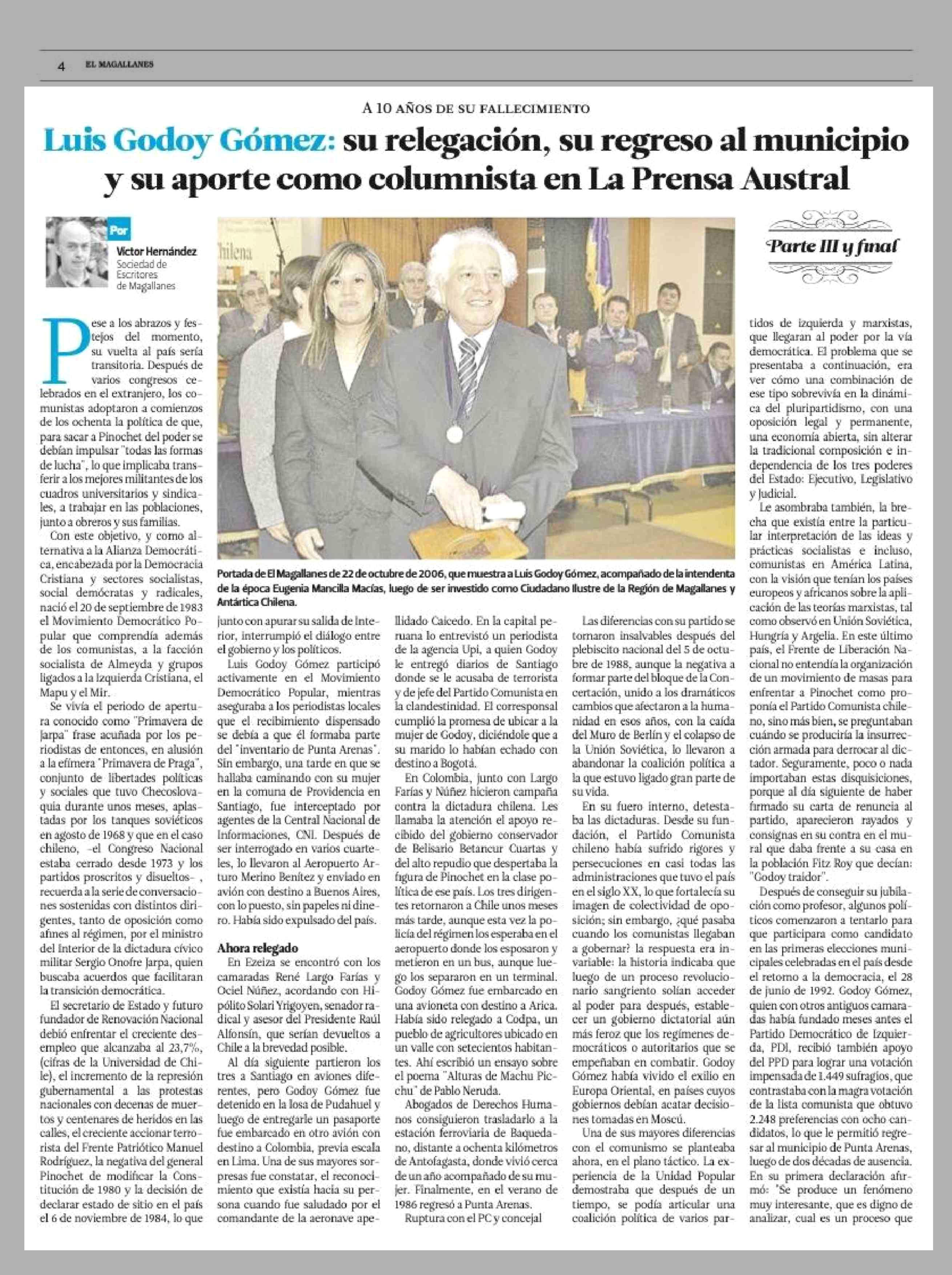 | Título: | Luis Godoy Gómez: su relegación, su regreso al municipio y su aporte como columnista en La Prensa Austral |