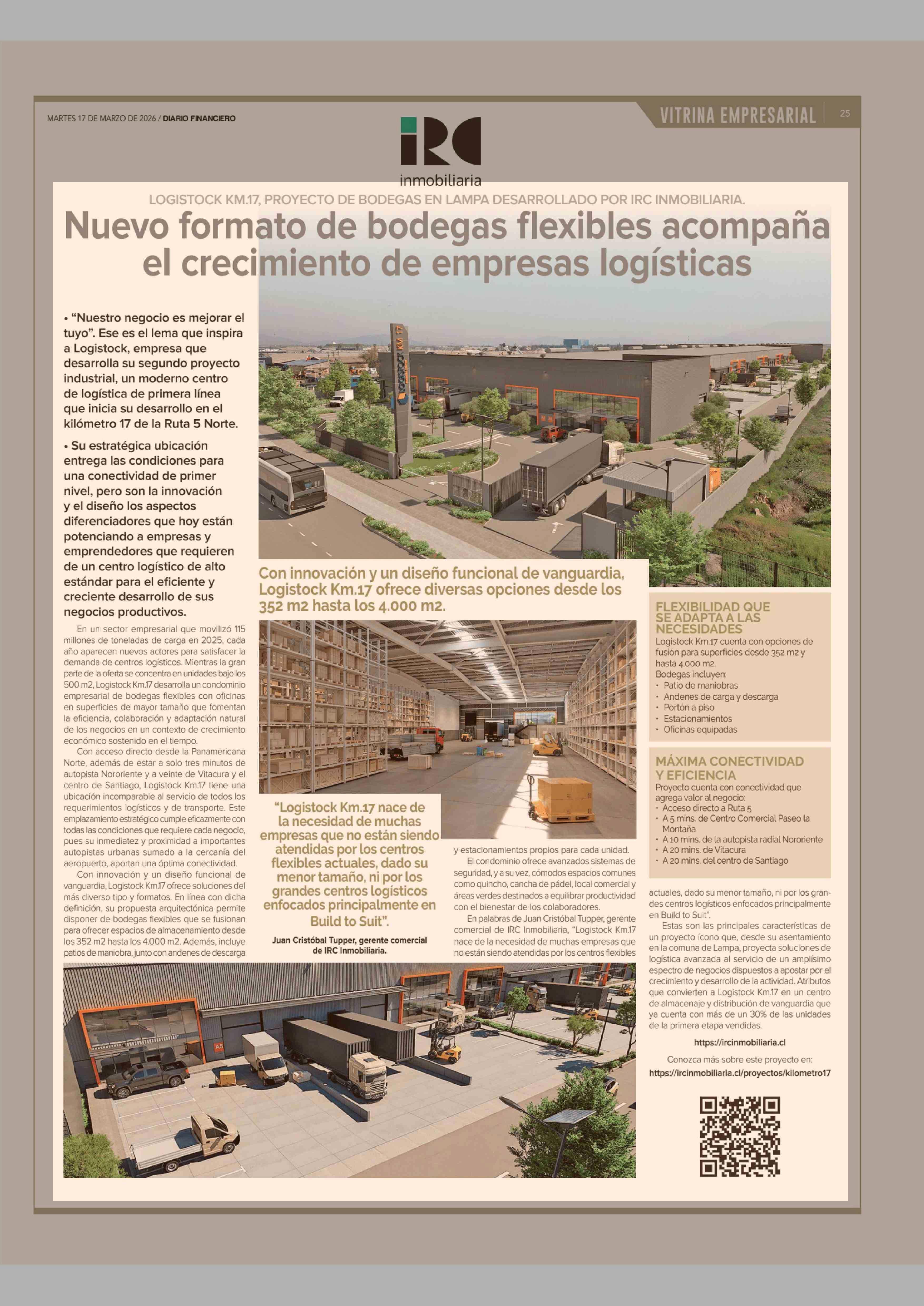 Nuevo formato de bodegas flexibles acompaña el crecimiento de empresas logísticas 17-03-2026 Diario Financiero |