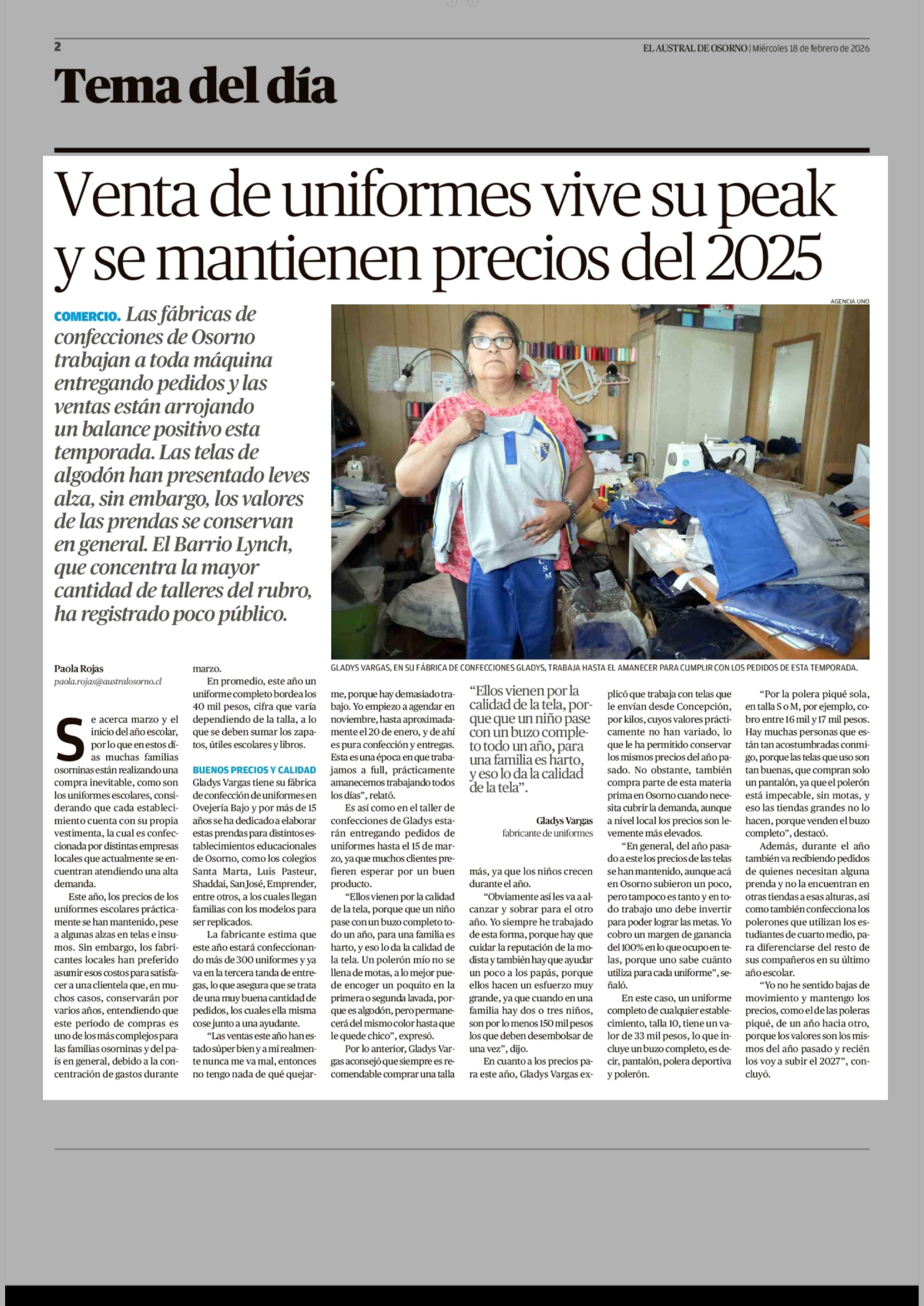 Venta de uniformes vive su peak y se mantienen precios del 2025 18-02-2026 El Austral de Osorno |