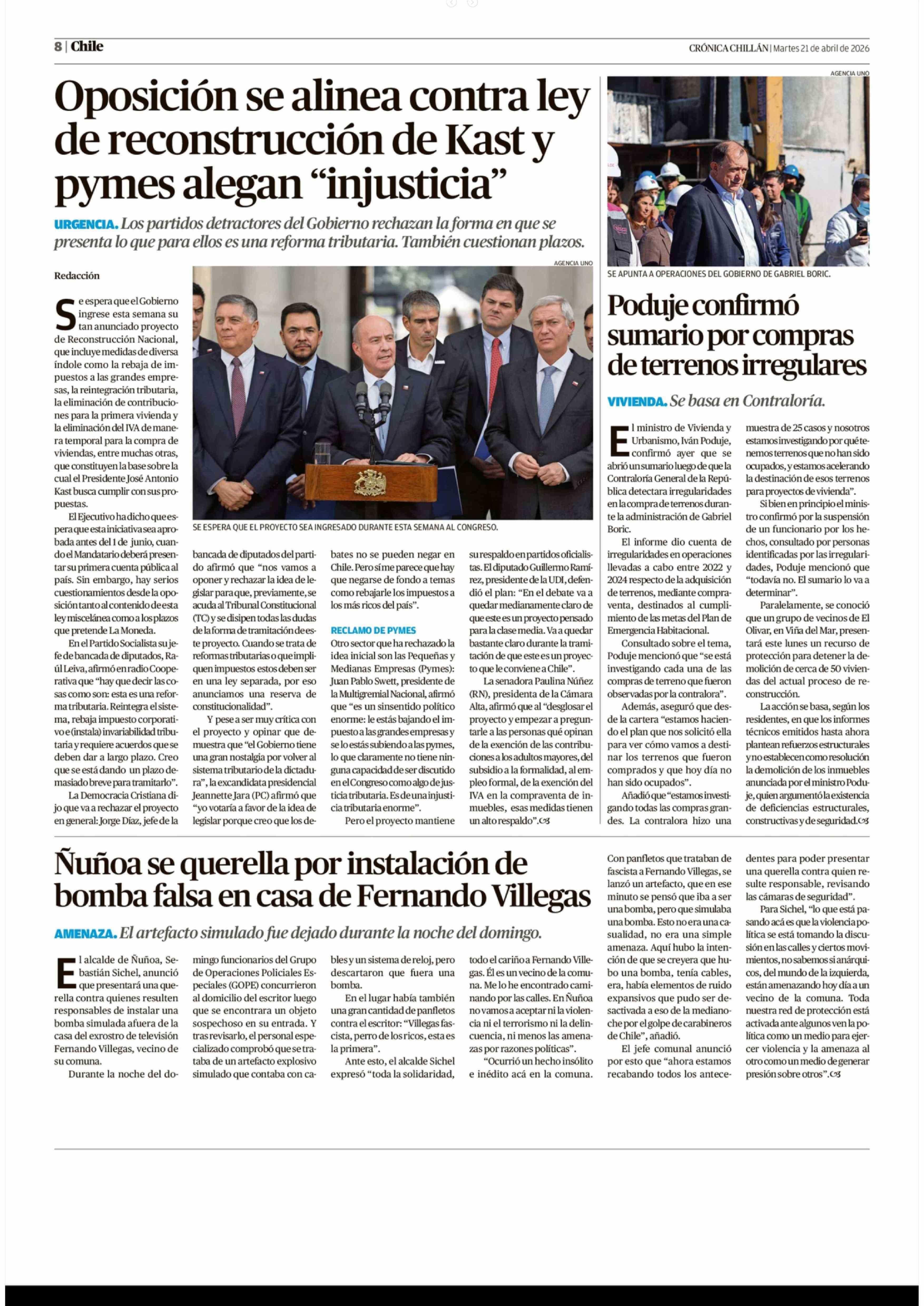 Oposición se alinea contra ley de reconstrucción de Kast y pymes alegan "injusticia" 21-04-2026 Crónica de Chillán |