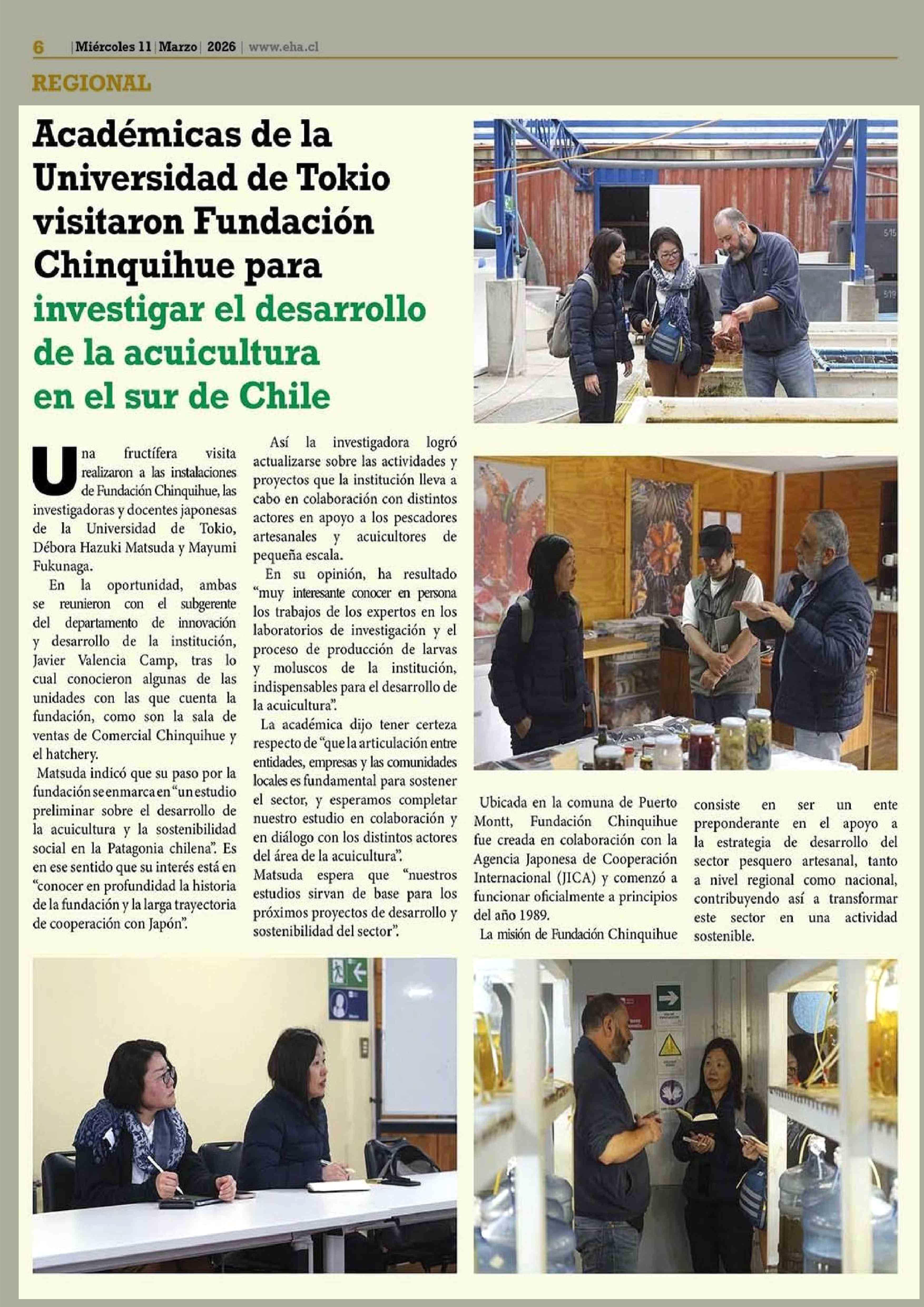Académicas de la Universidad de Tokio visitaron Fundación Chinquihue para investigar el desarrollo de la acuicultura en el sur de Chile 11-03-2026 El Heraldo Austral |