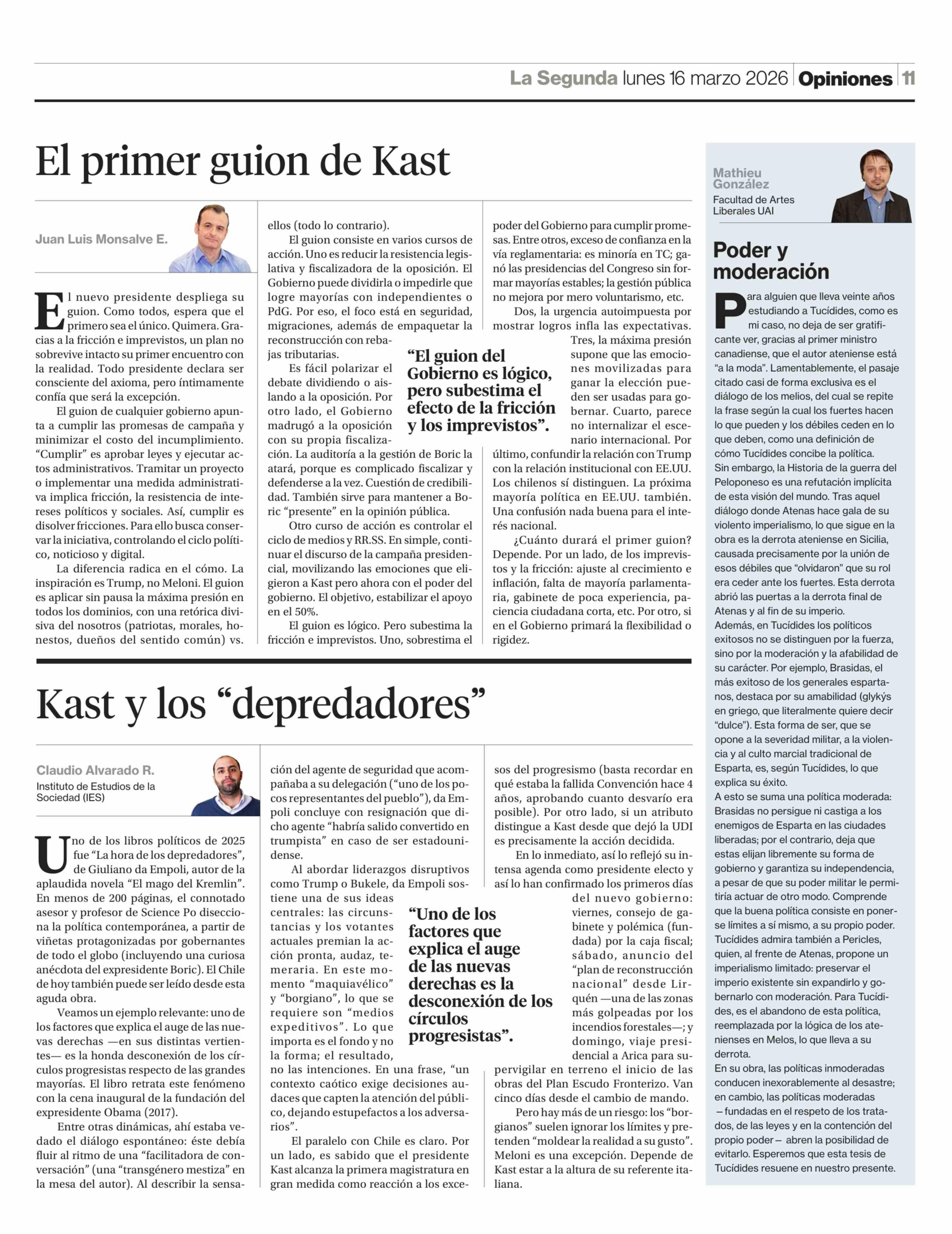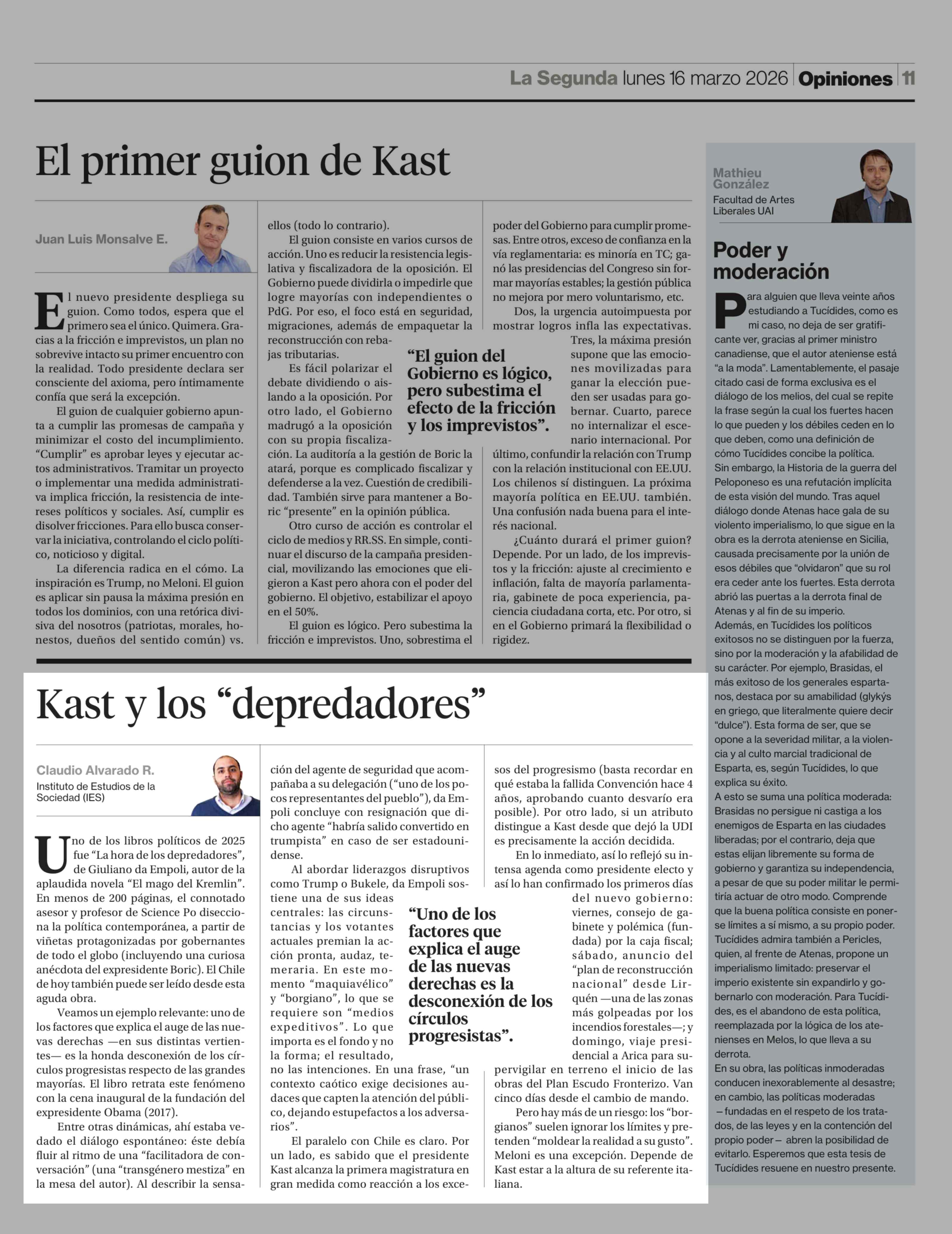 Columnas de Opinión: Kast y los "depredadores" 16-03-2026 La Segunda |