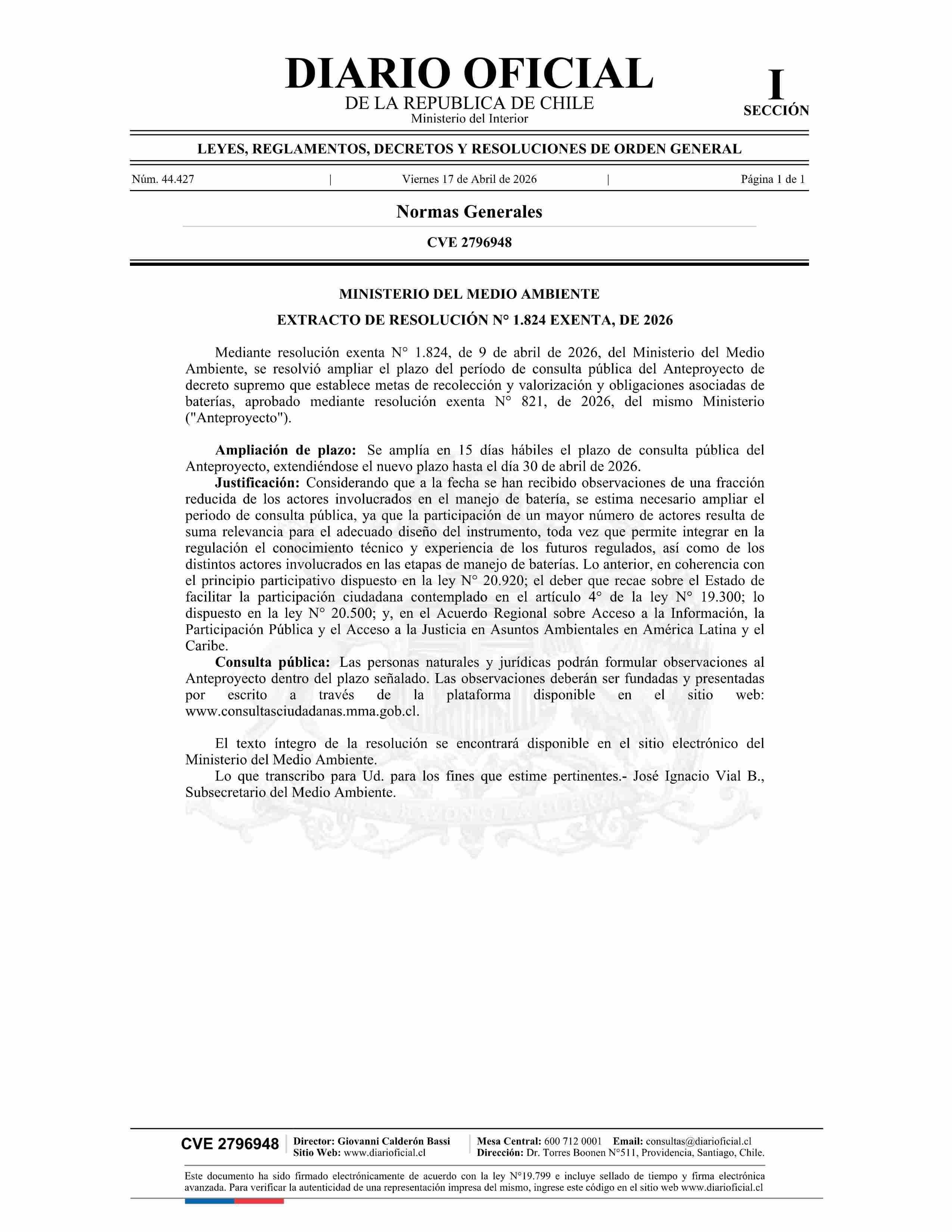 MINISTERIO DEL MEDIO AMBIENTE 17-04-2026 Diario Oficial Edición Electrónica |