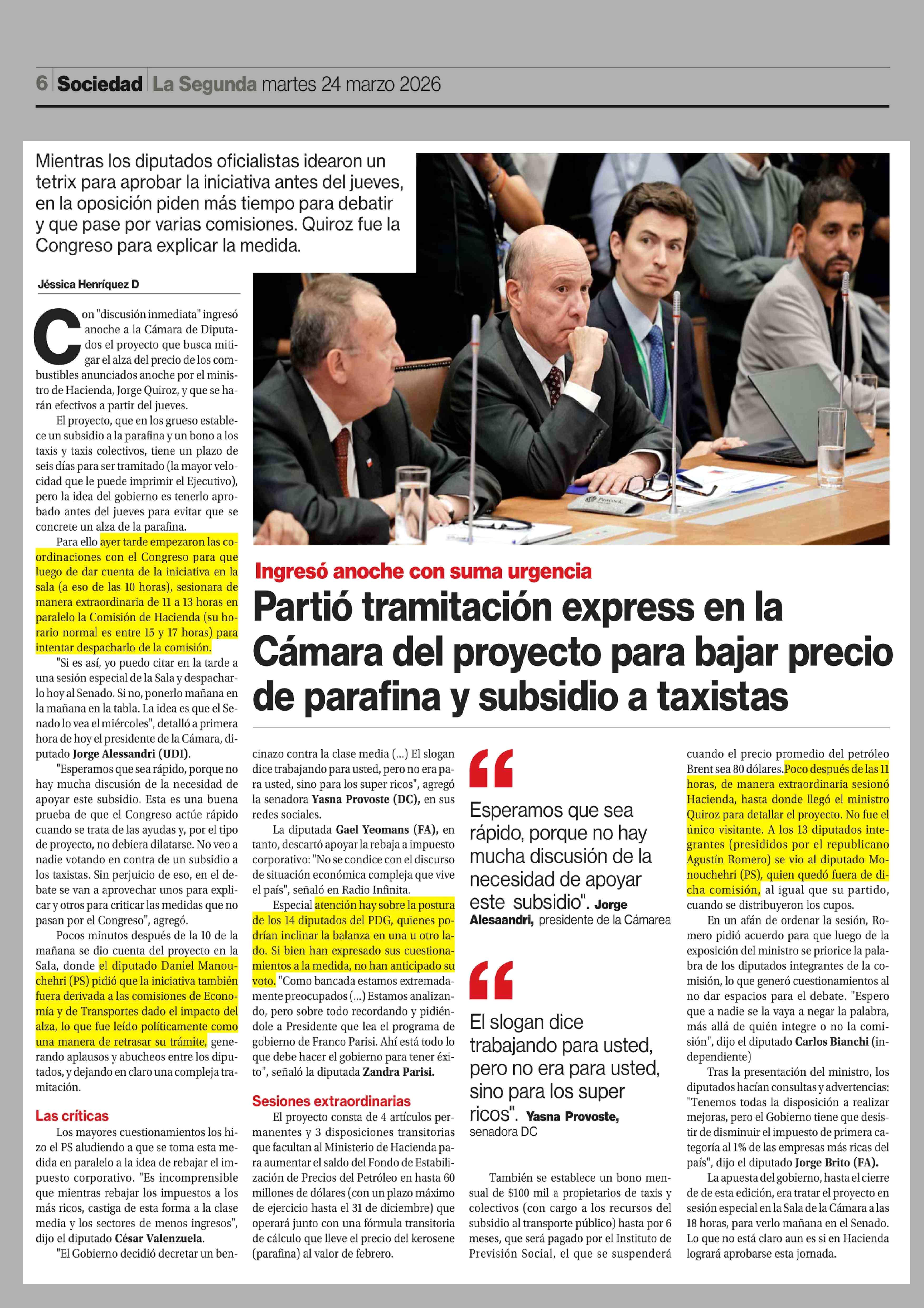 Partió tramitación express en la Cámara del proyecto para bajar precio de parafina y subsidio a taxistas 24-03-2026 La Segunda |