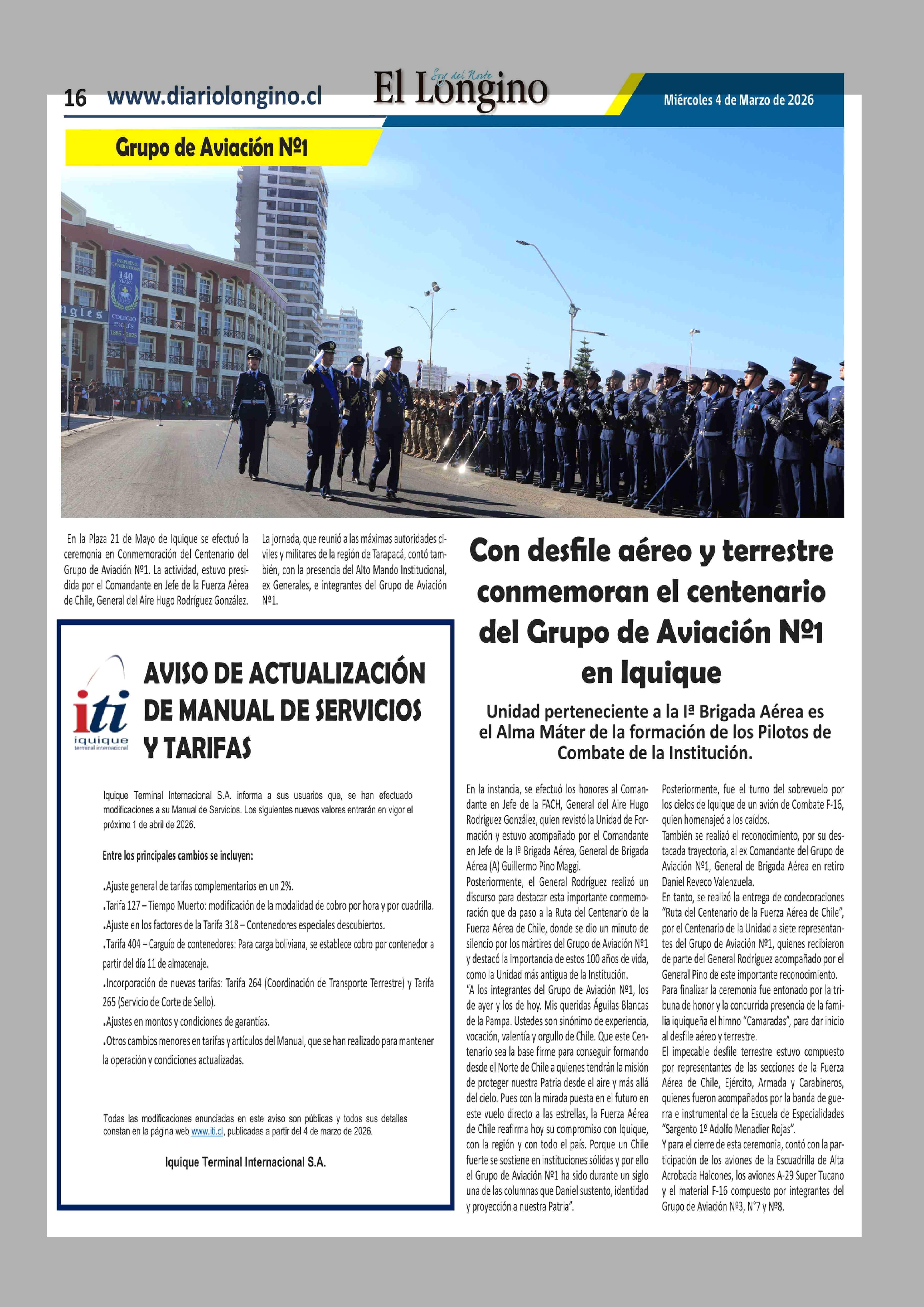 Con desfile aéreo y terrestre conmemoran el centenario del Grupo de Aviación Nº1 en Iquique 04-03-2026 El Longino |