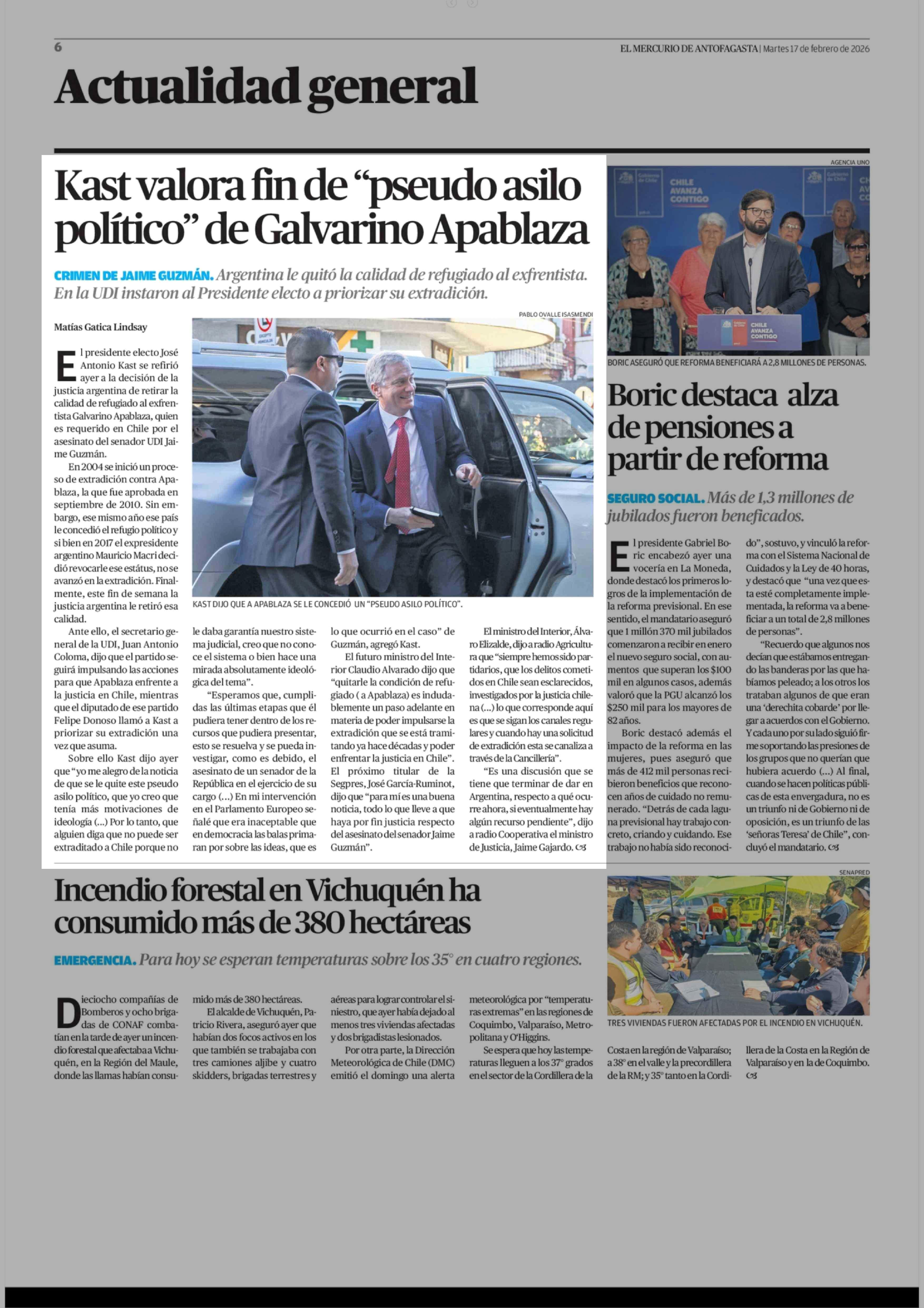 Kast valora fin de "pseudo asilo político" de Galvarino Apablaza 17-02-2026 El Mercurio de Antofagasta |