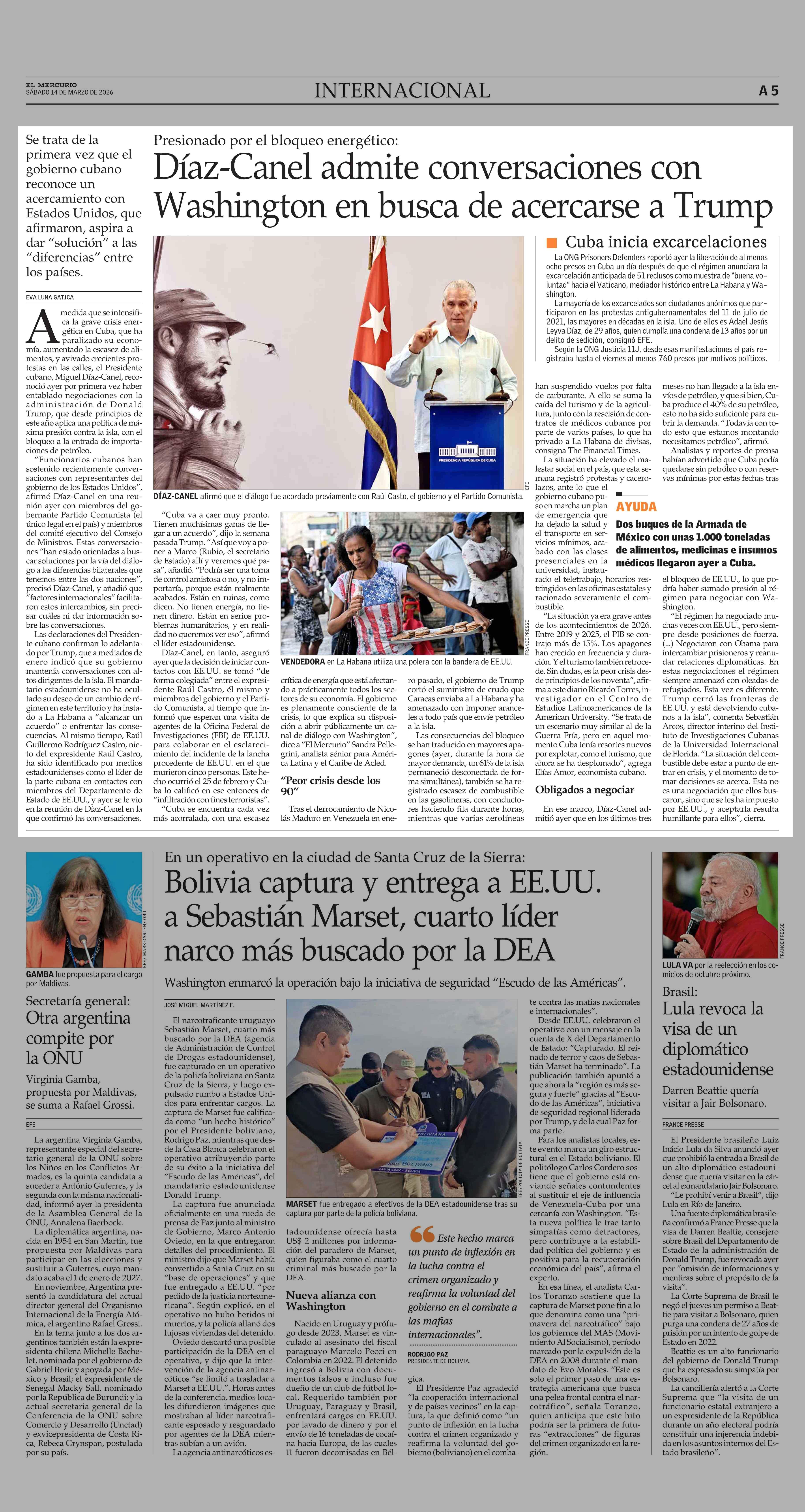 Díaz-Canel admite conversaciones con Washington en busca de acercarse a Trump 14-03-2026 El Mercurio |