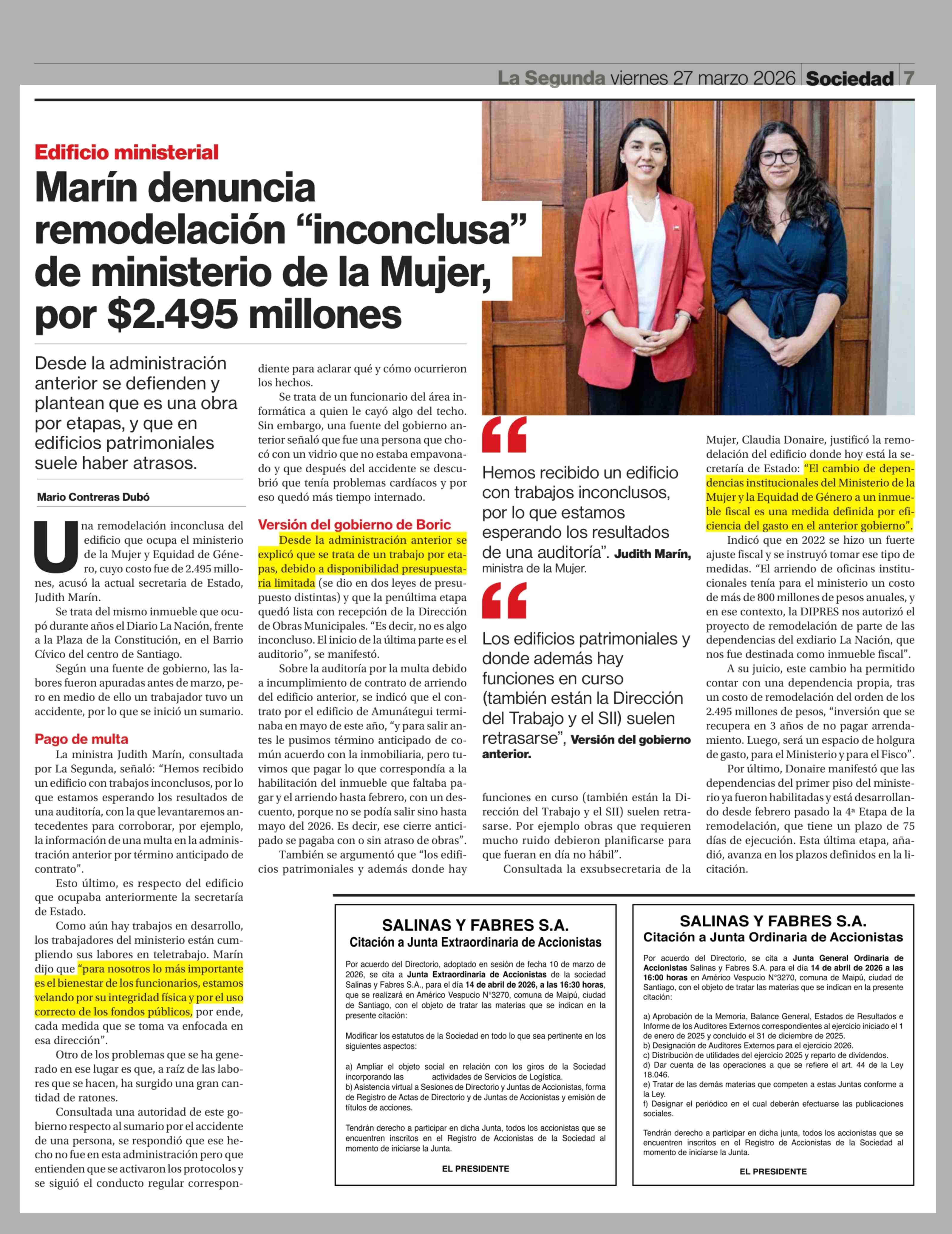Marín denuncia remodelación "inconclusa" de ministerio de la Mujer, por $2.495 millones 27-03-2026 La Segunda |