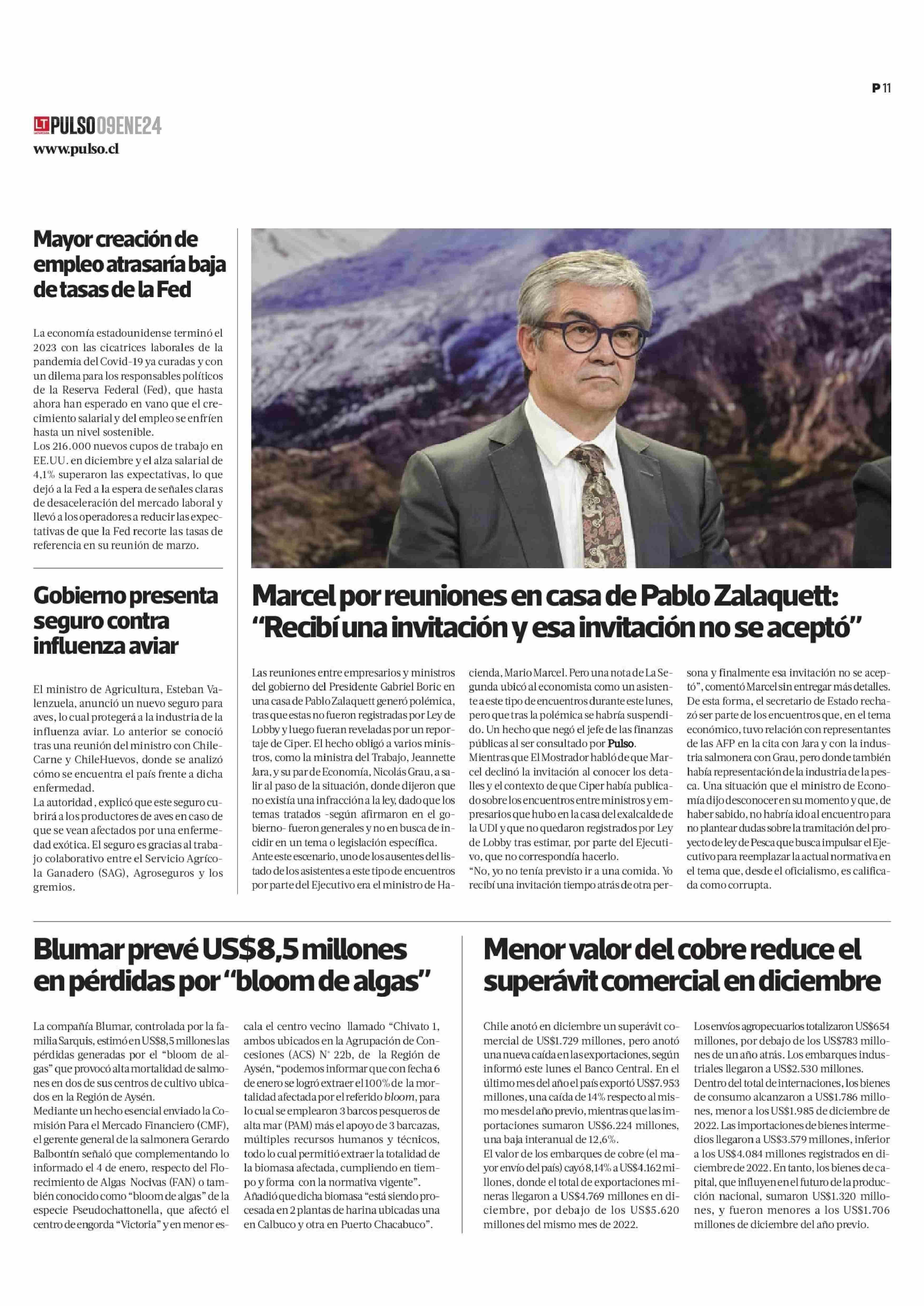 Blumar prevé US$8,5 millones en pérdidas por “bloom de algas” 09-01-2024 La Tercera |