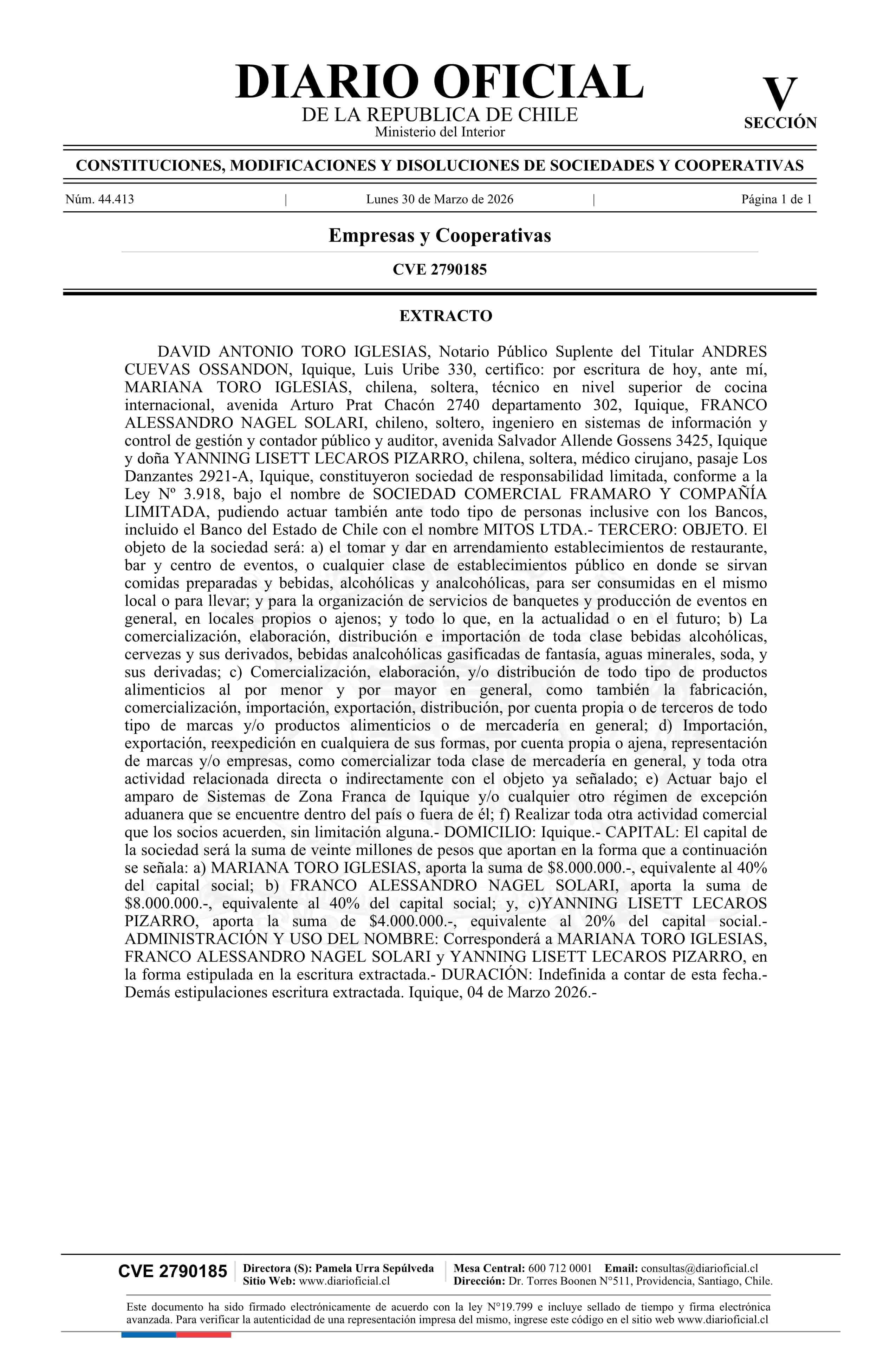 Título: SOCIEDAD COMERCIAL FRAMARO Y COMPAÑÍA LIMITADA