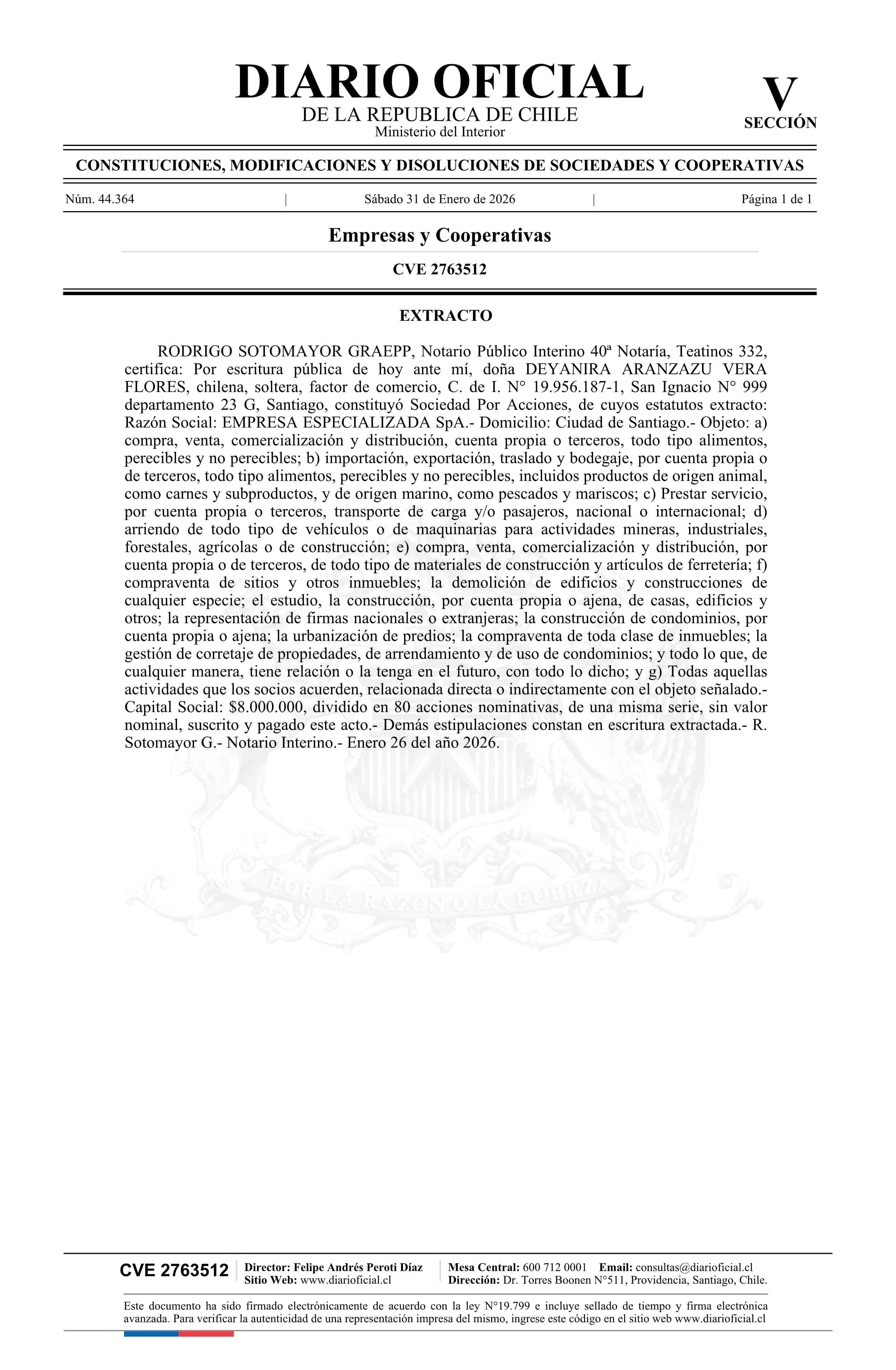 EMPRESA ESPECIALIZADA SpA 31-01-2026 Diario Oficial Edición Electrónica |