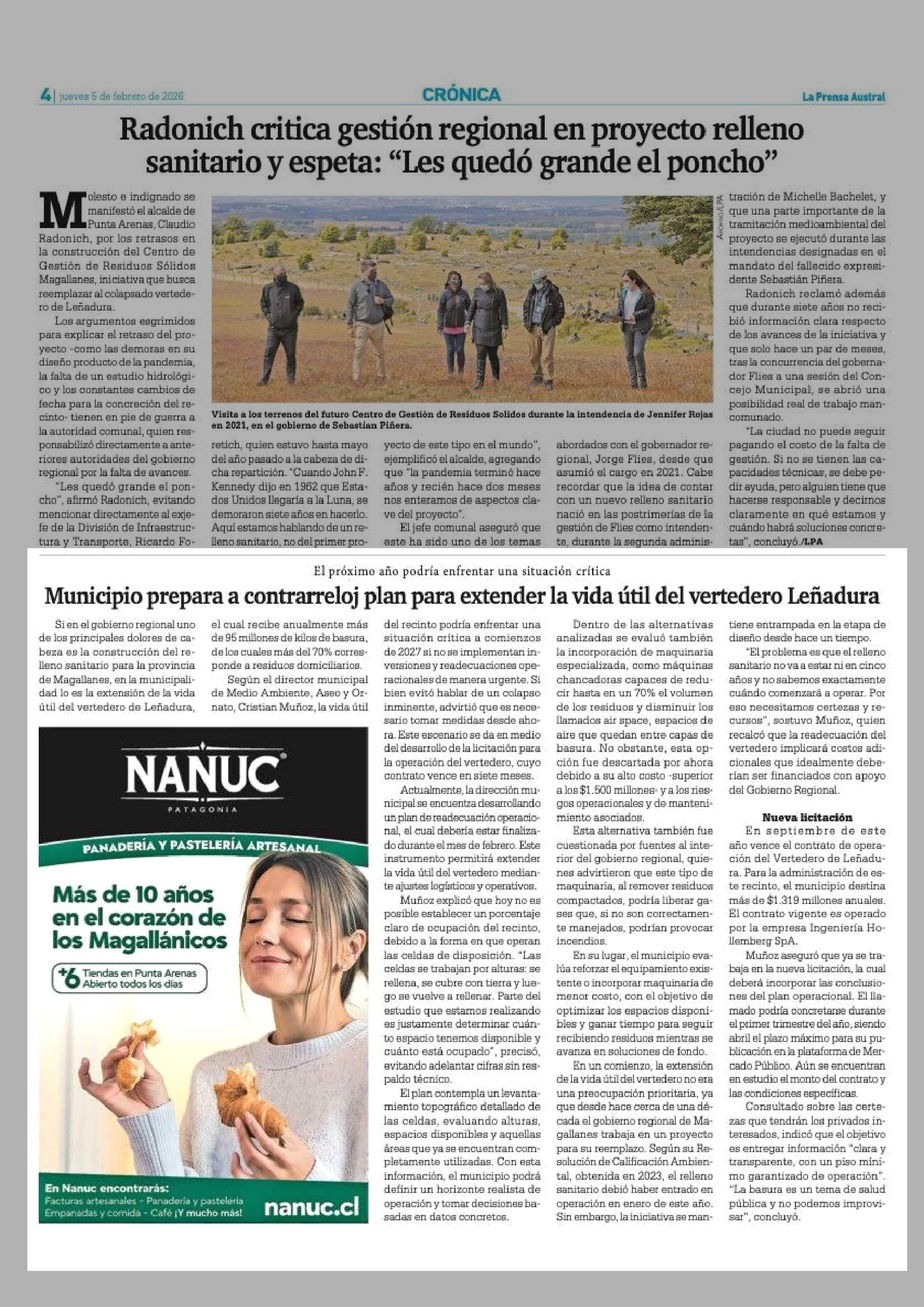 Municipio prepara a contrarreloj plan para extender la vida útil del vertedero Leñadura 05-02-2026 La Prensa Austral |