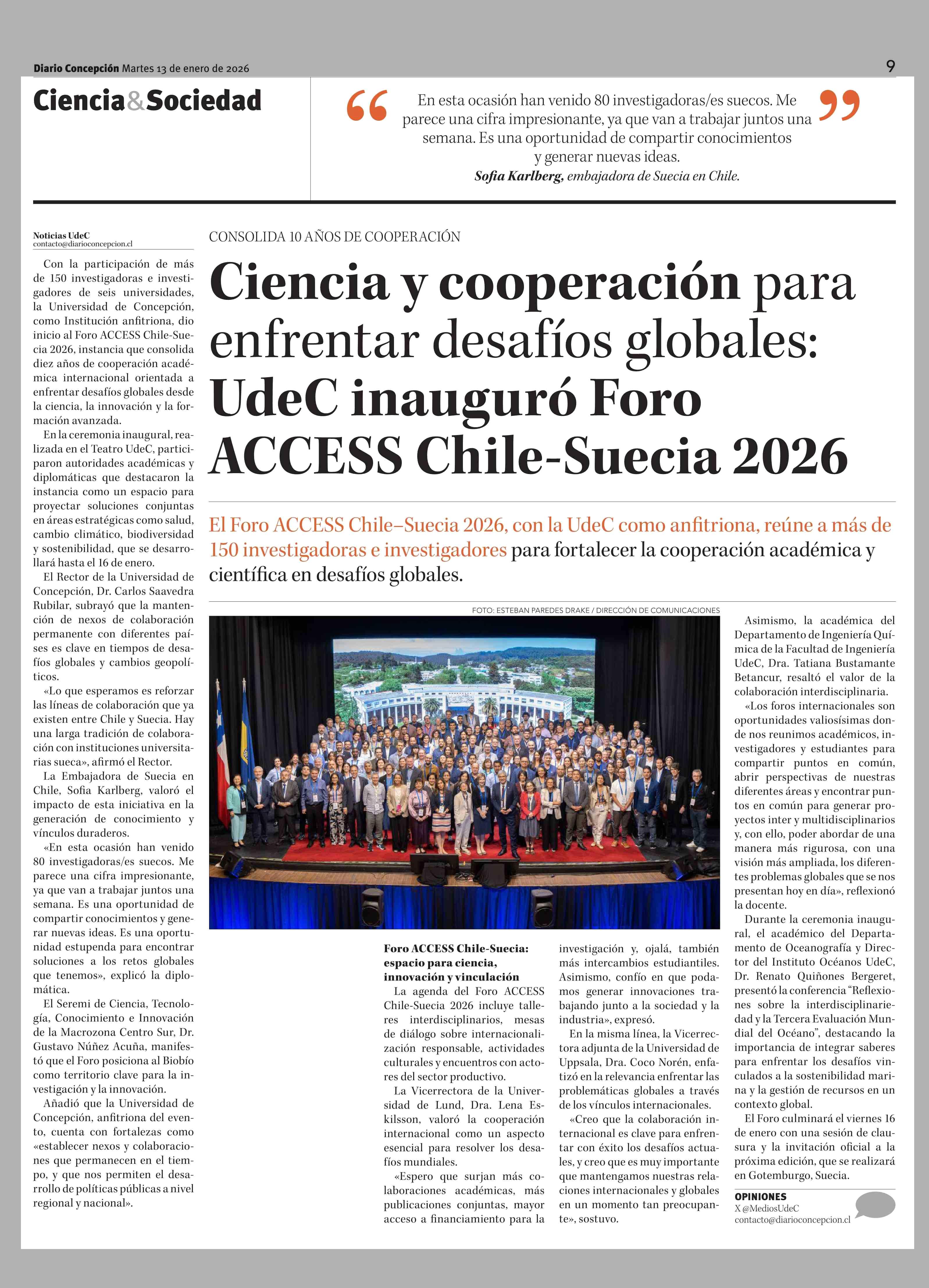 Título: Ciencia y cooperación para enfrentar desafíos globales: UdeC inauguró Foro ACCESS Chile-Suecia 2026