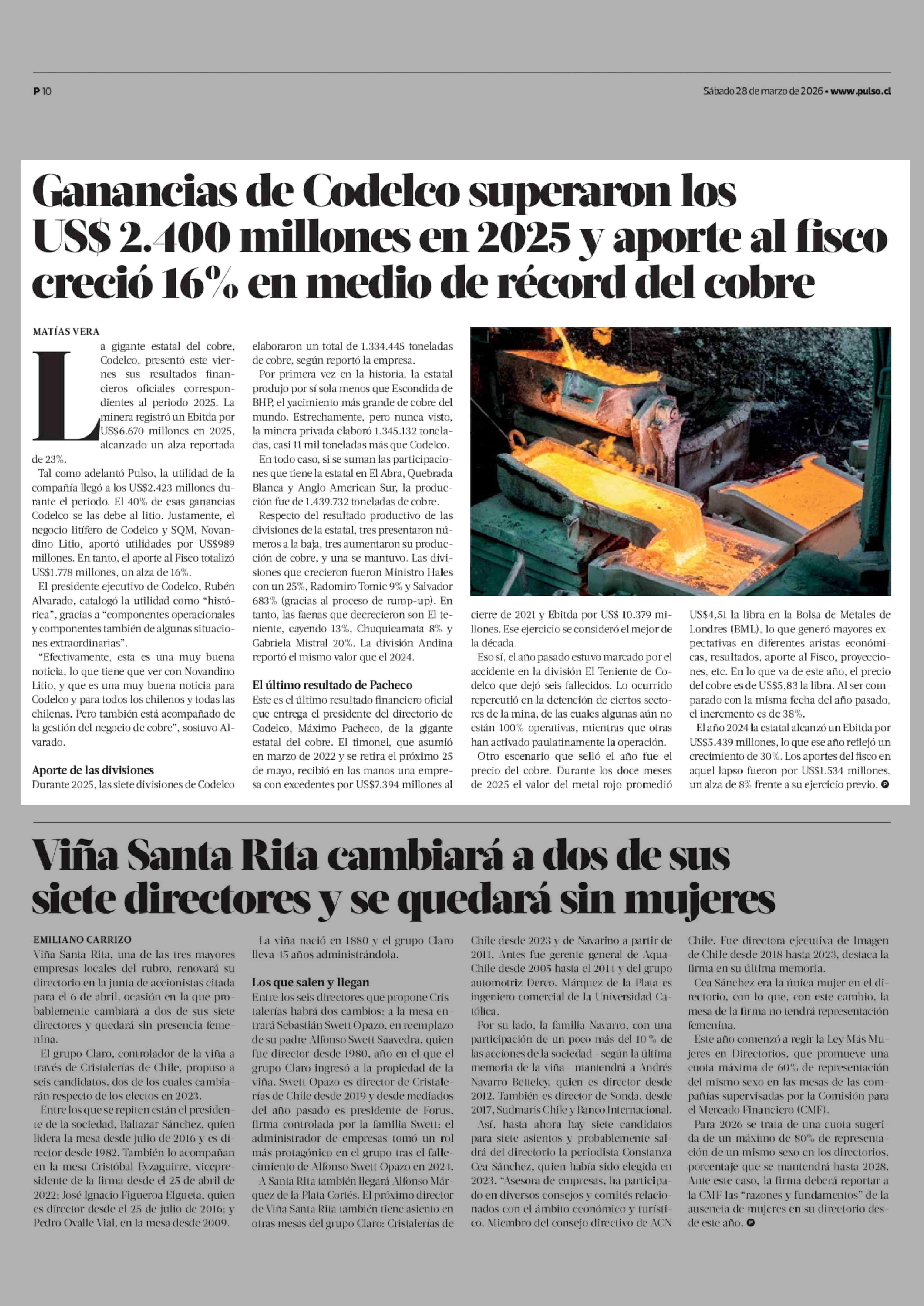 Título: Ganancias de Codelco superaron los US$ 2.400 millones en 2025 y aporte al fisco creció 16% en medio de récord del cobre
