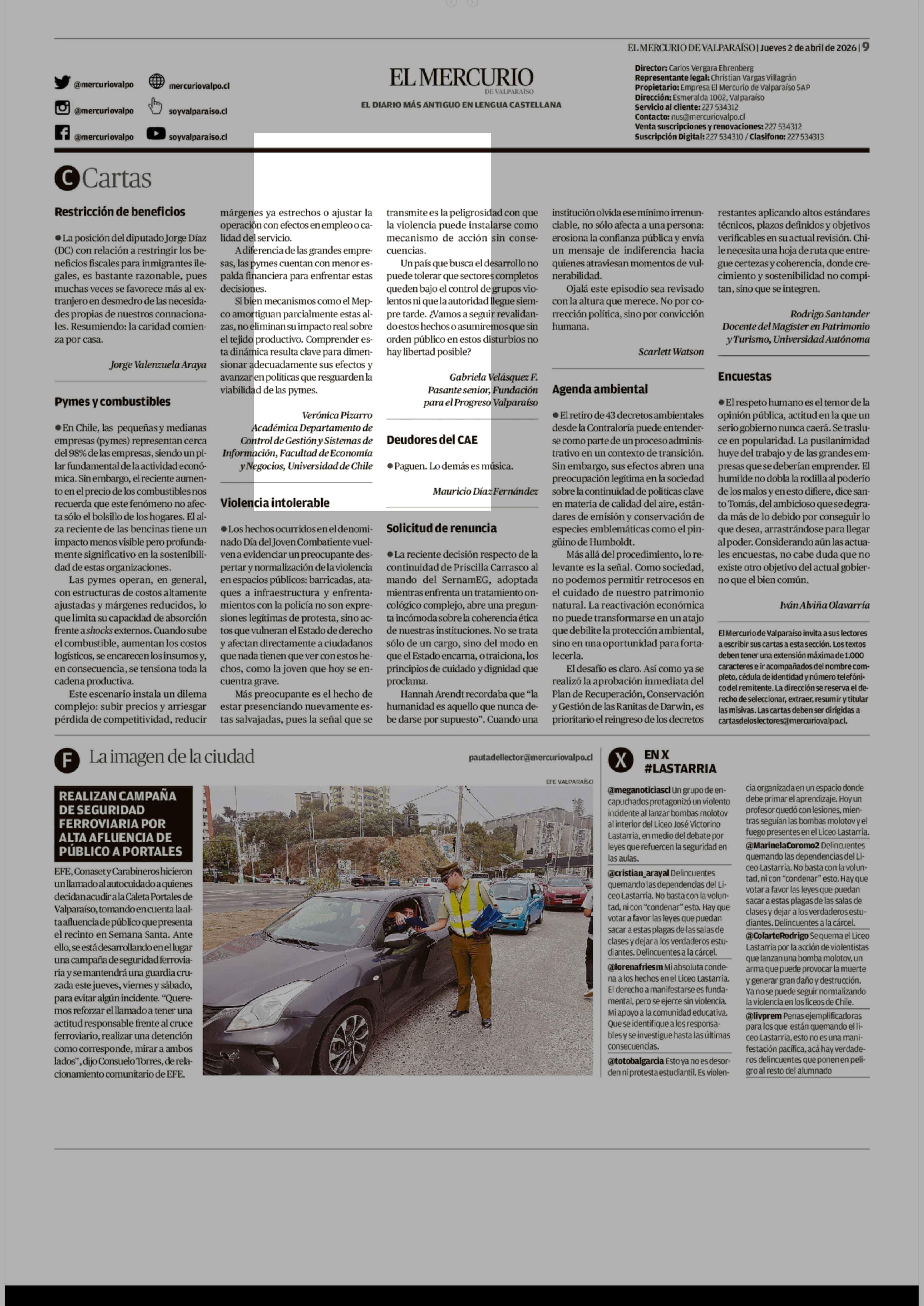 Cartas: Violencia en colegios 02-04-2026 El Mercurio de Valparaíso |