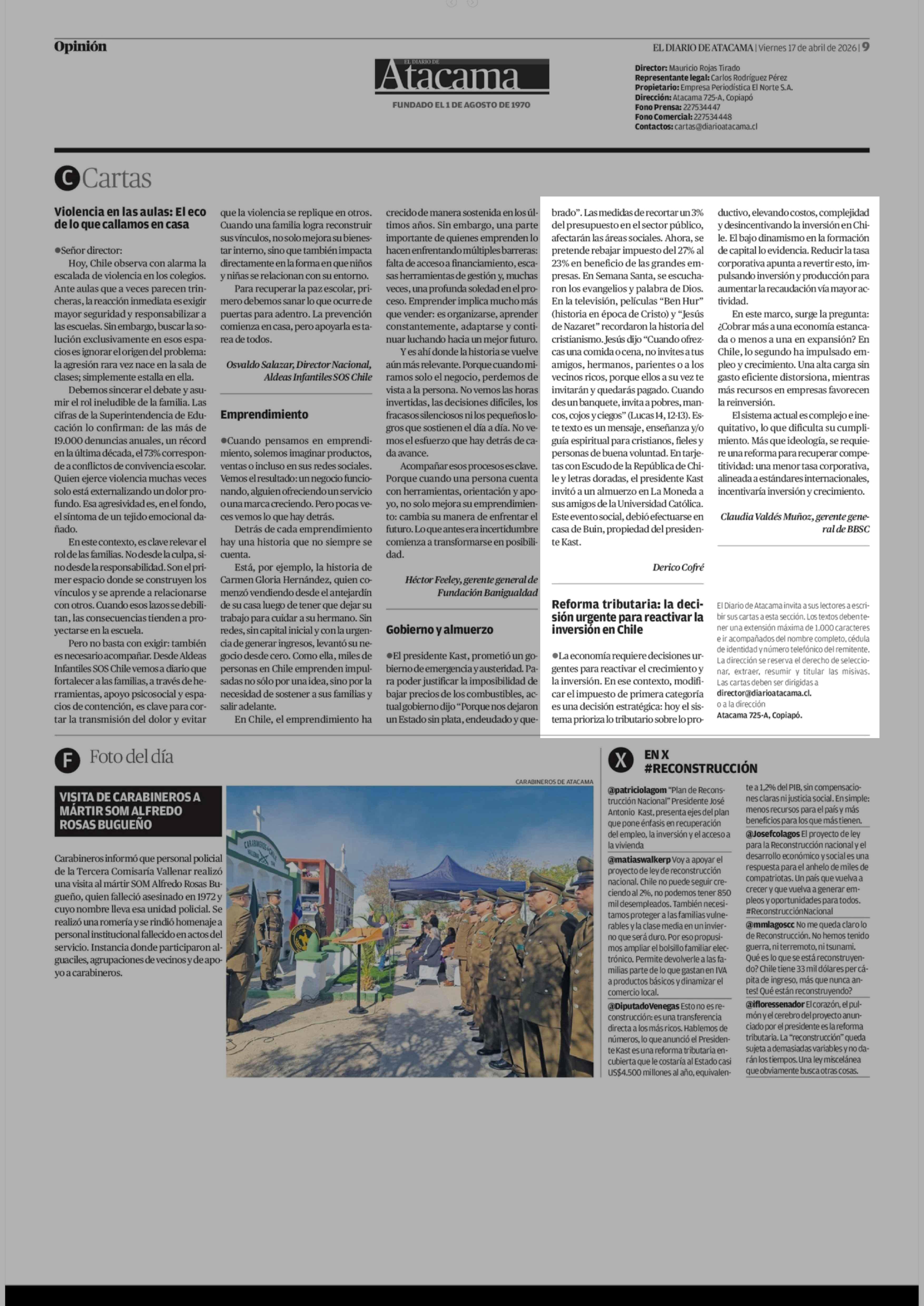 Cartas: Reforma tributaria: la decisión urgente para reactivar la inversión en Chile 17-04-2026 El Diario de Atacama |