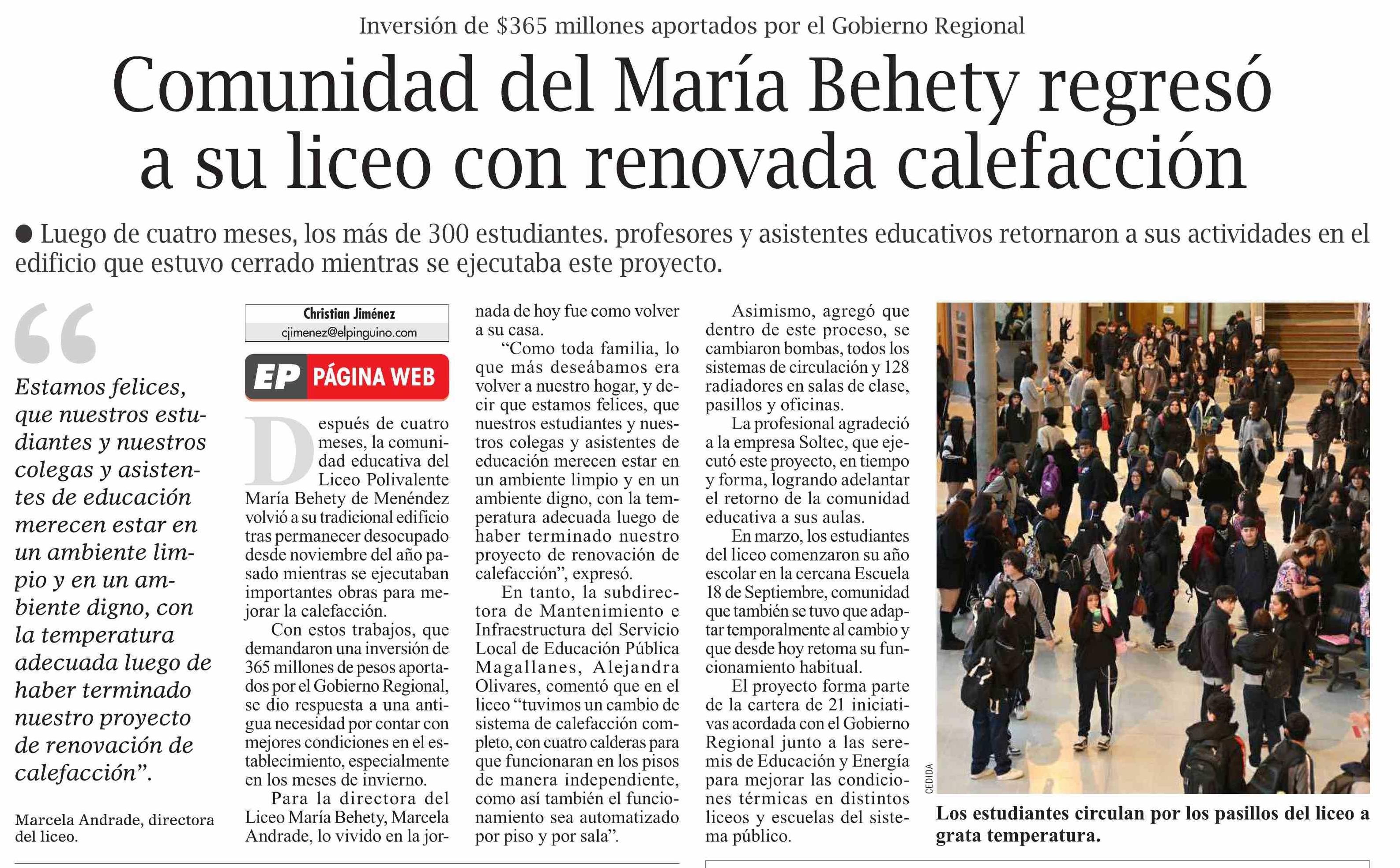 Título: Comunidad del María Behety regresó a su liceo con renovada calefacción