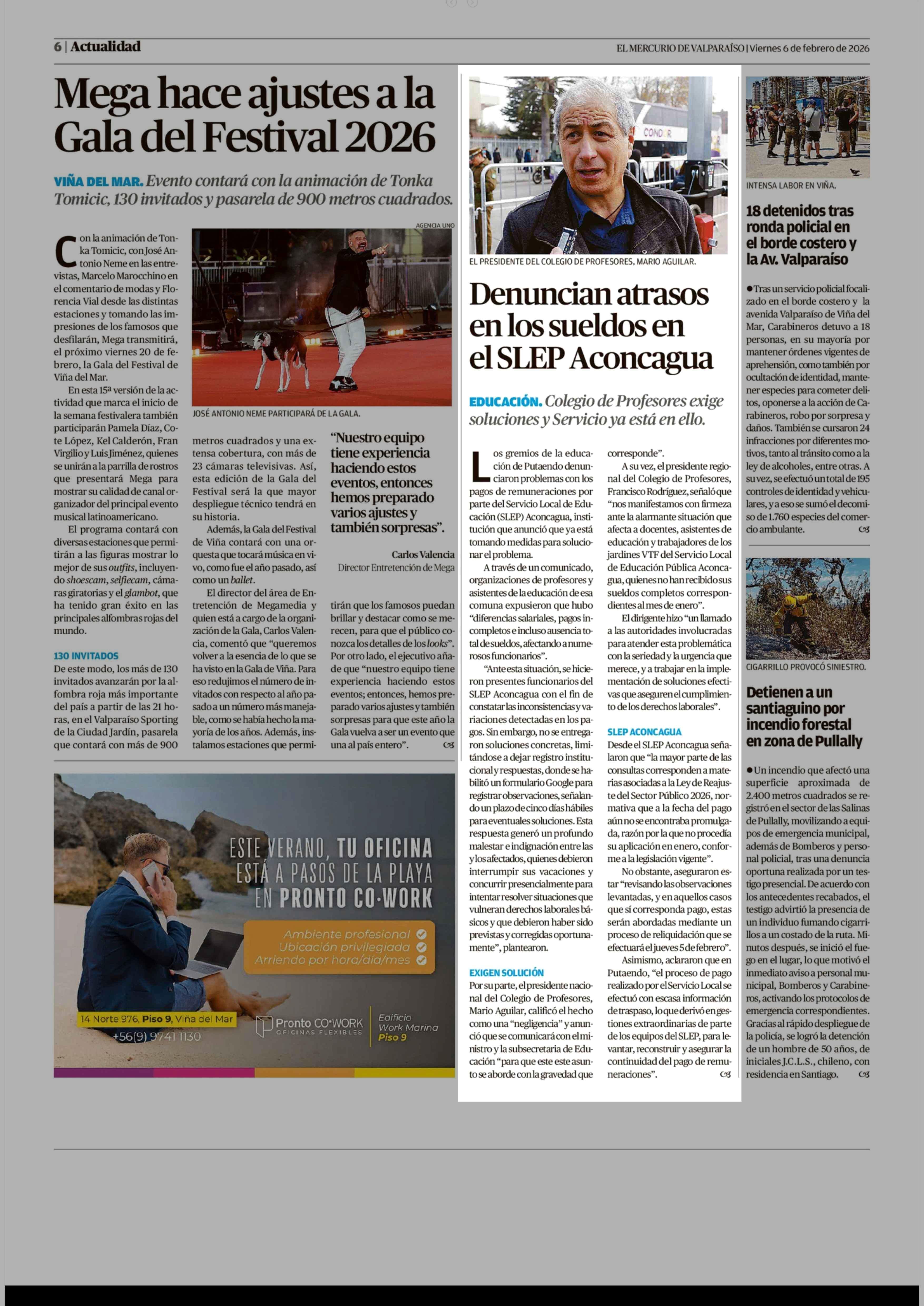 Denuncian atrasos en los sueldos en el SLEP Aconcagua 06-02-2026 El Mercurio de Valparaíso |