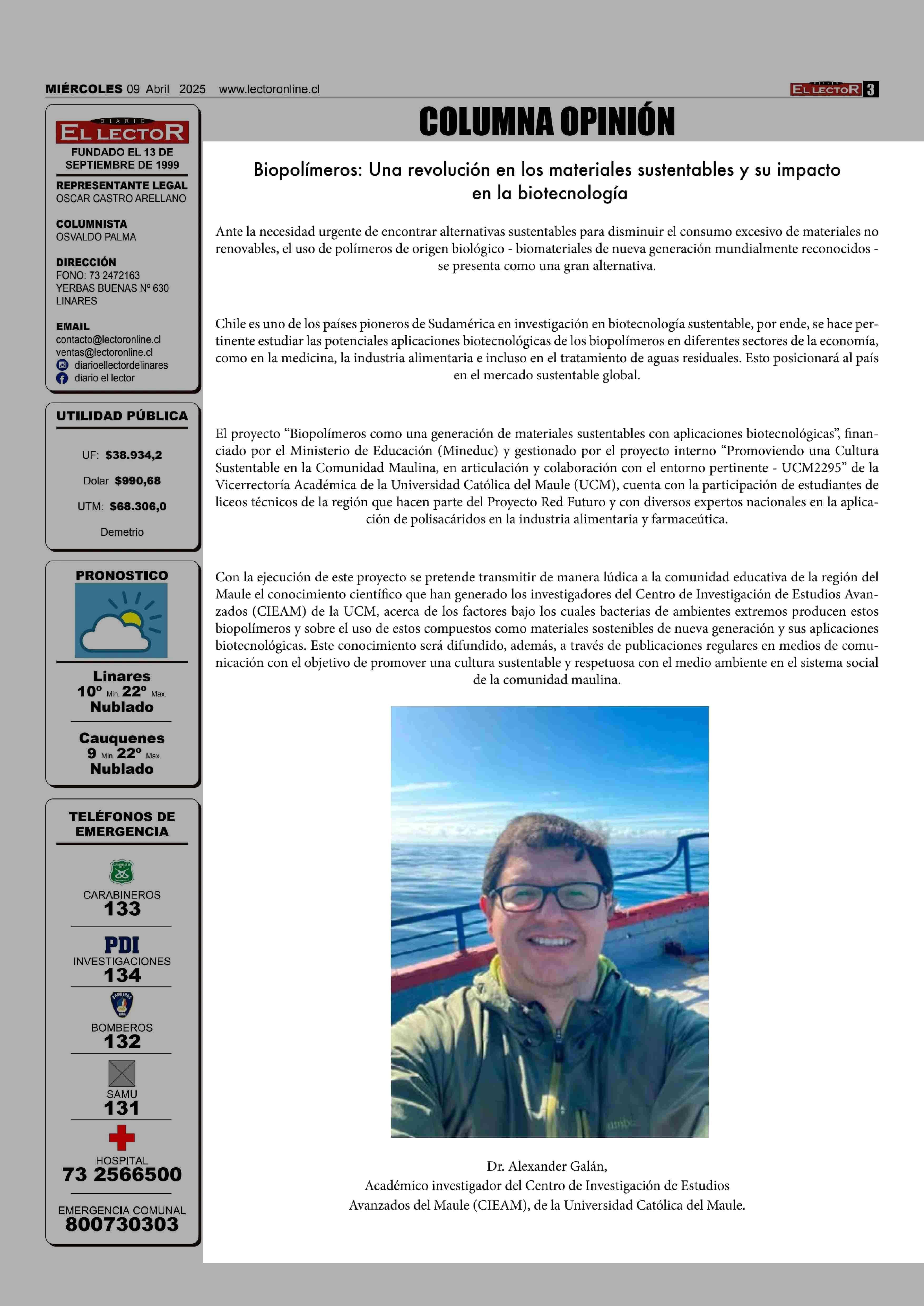 COLUMNAS DE OPINIÓN: Biopolímeros: Una revolución en los materiales sustentables y su impacto en la biotecnología 09-04-2025 El Lector |