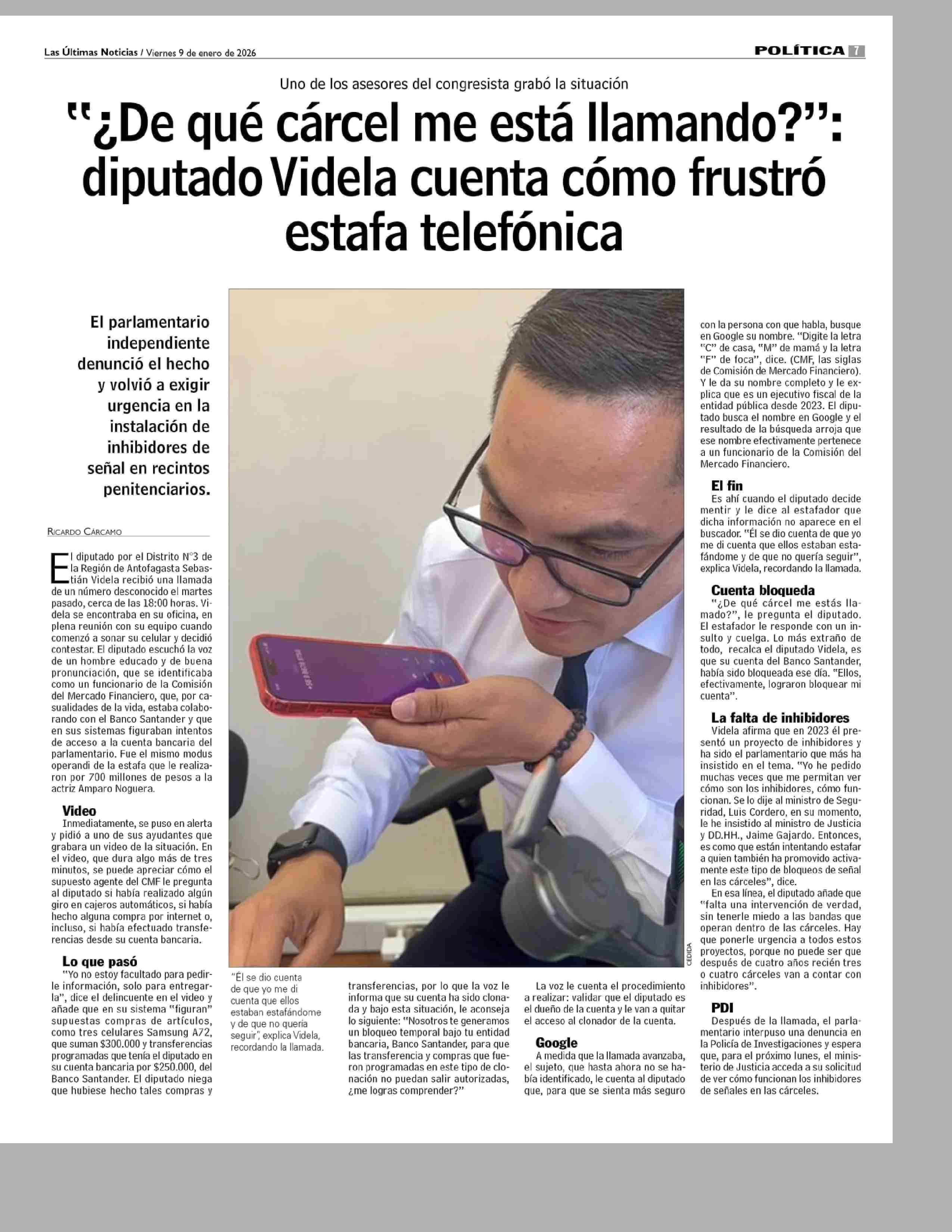 Título: "¿De qué cárcel me está Namando?”: diputado Videla cuenta como frustro estafa telefónica