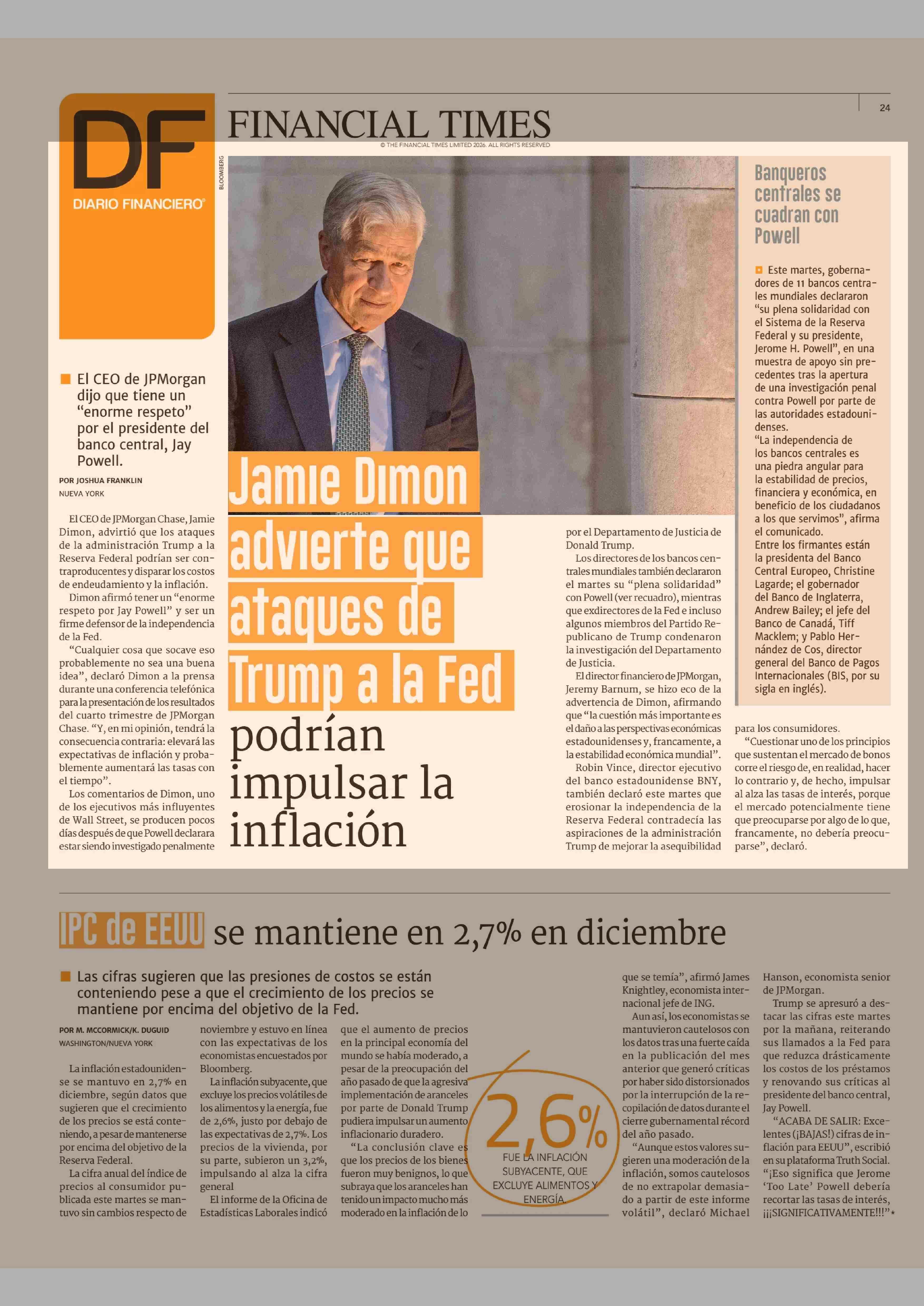 Jamie Dimon advierte que ataques de Trump a la Fed podrían impulsar la inflación 14-01-2026 Diario Financiero |