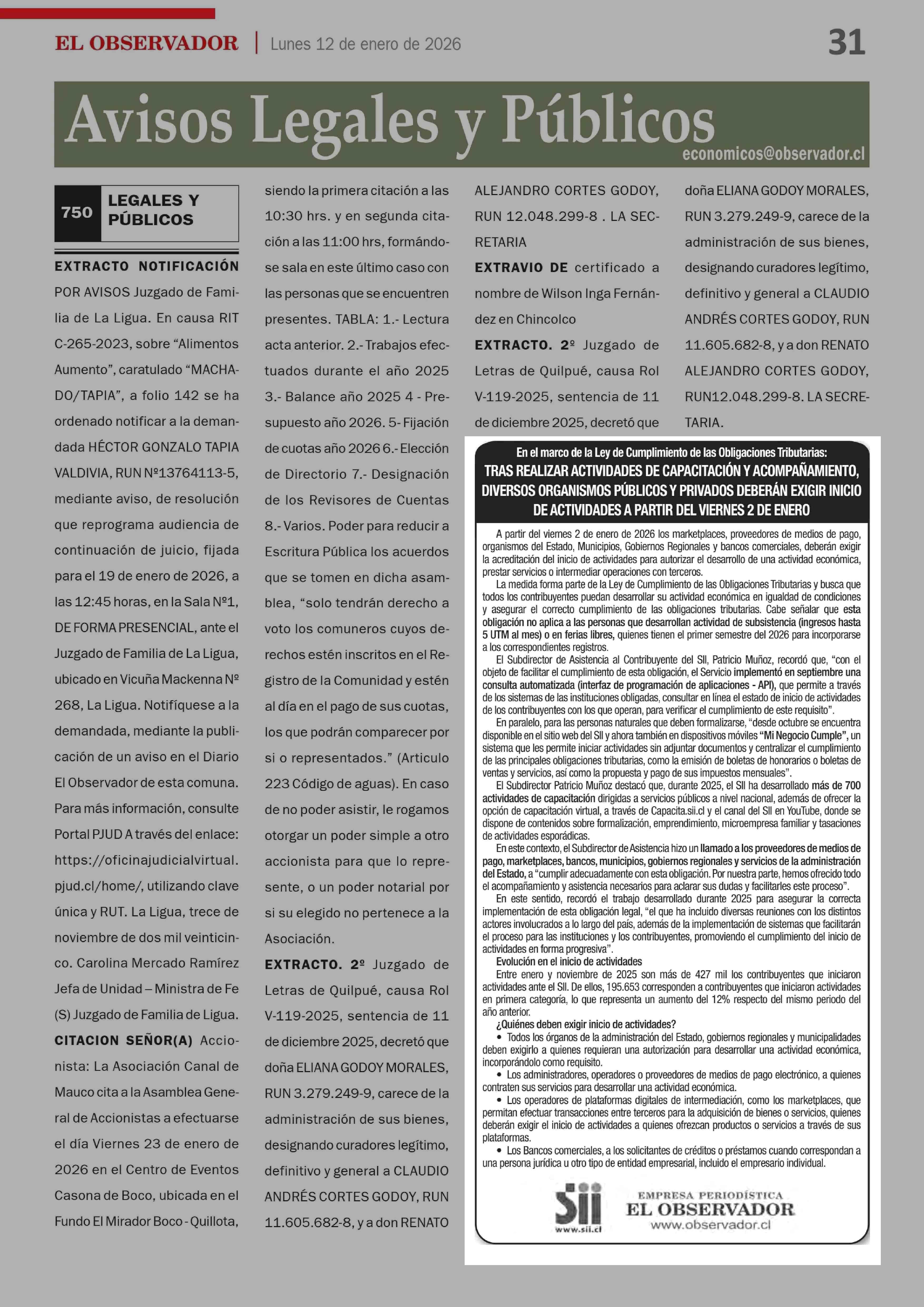 Extractos: SERVICIO DE IMPUESTOS INTERNOS 12-01-2026 El Observador Vespertino |