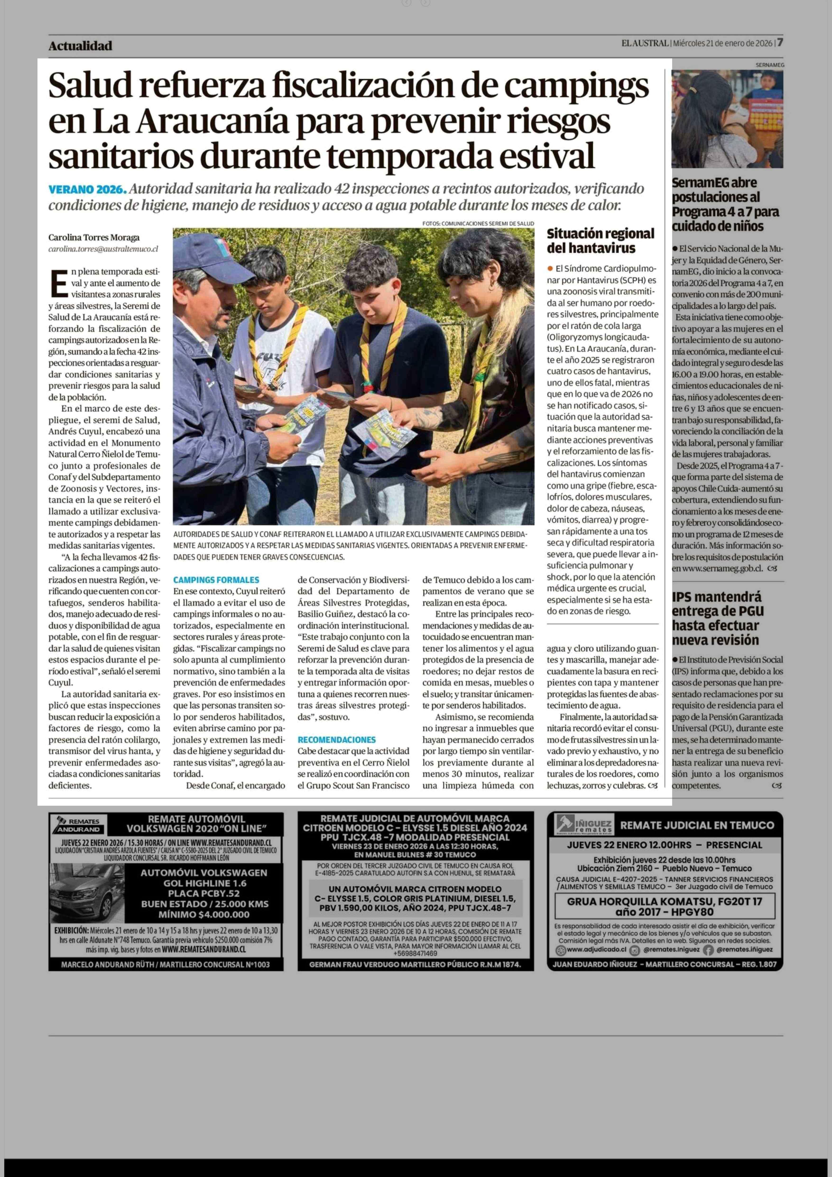 Salud refuerza fiscalización de campings en La Araucanía para prevenir riesgos sanitarios durante temporada estival 21-01-2026 El Austral de la Araucanía |
