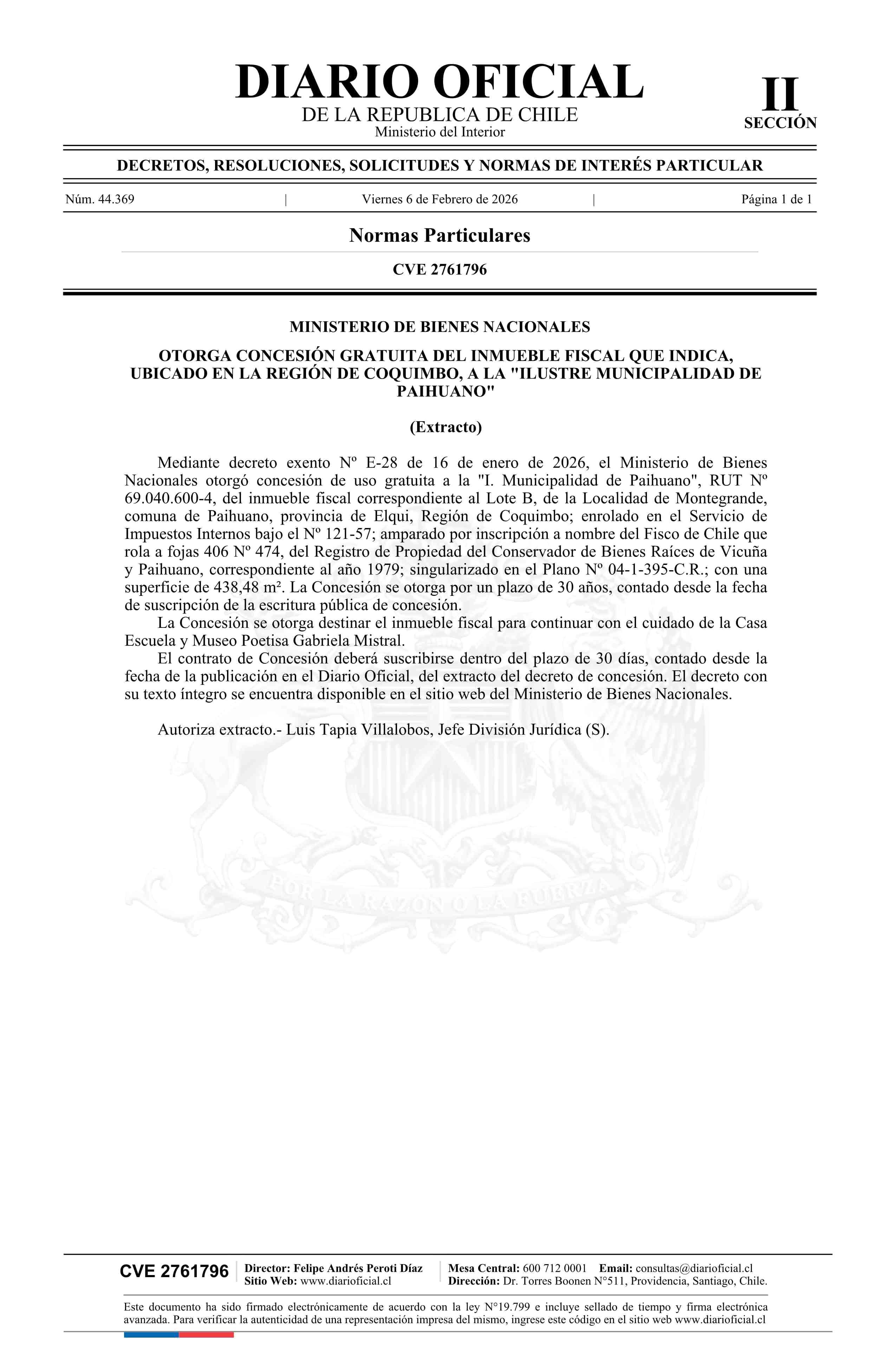 Extracto de decreto exento número E-28, de 2026.- Otorga concesión gratuita del inmueble fiscal que indica, ubicado en la Región de Coquimbo, a la Ilustre Municipalidad de Paihuano