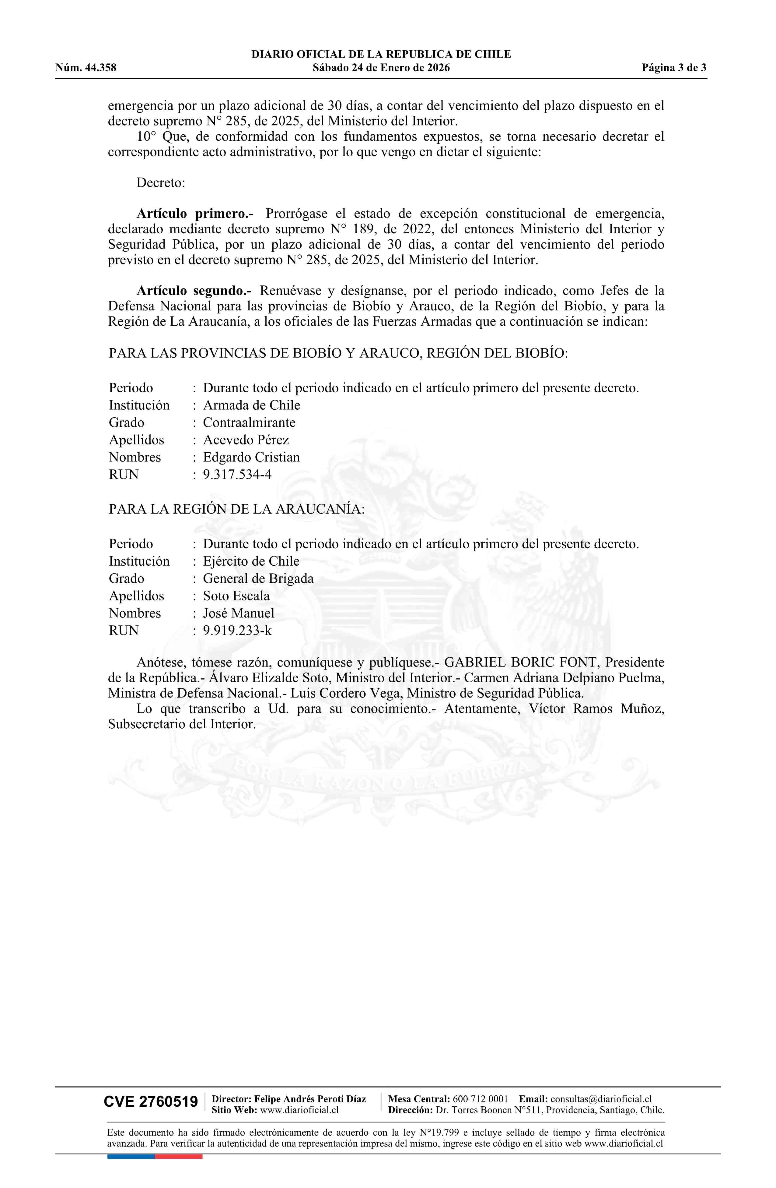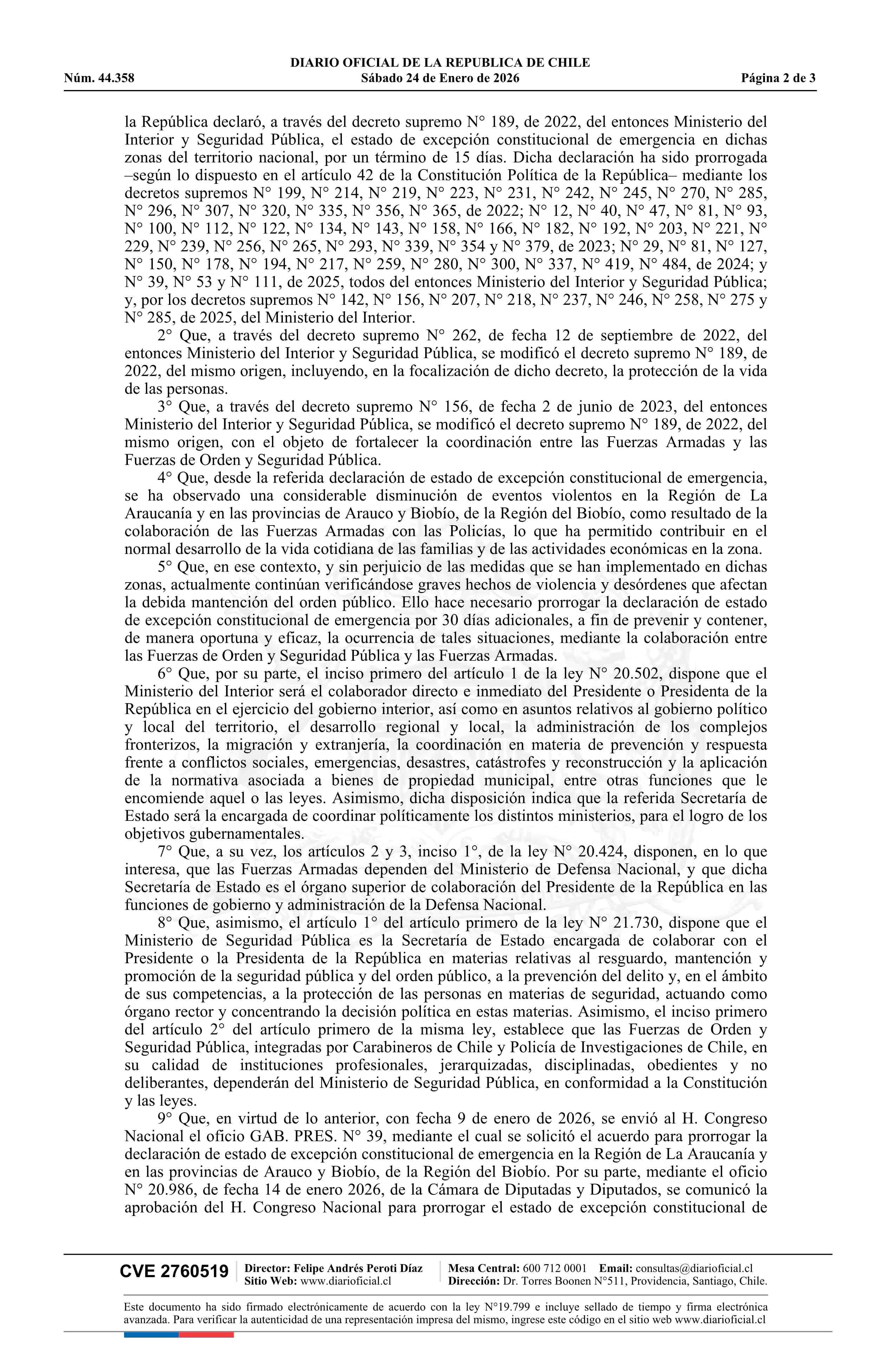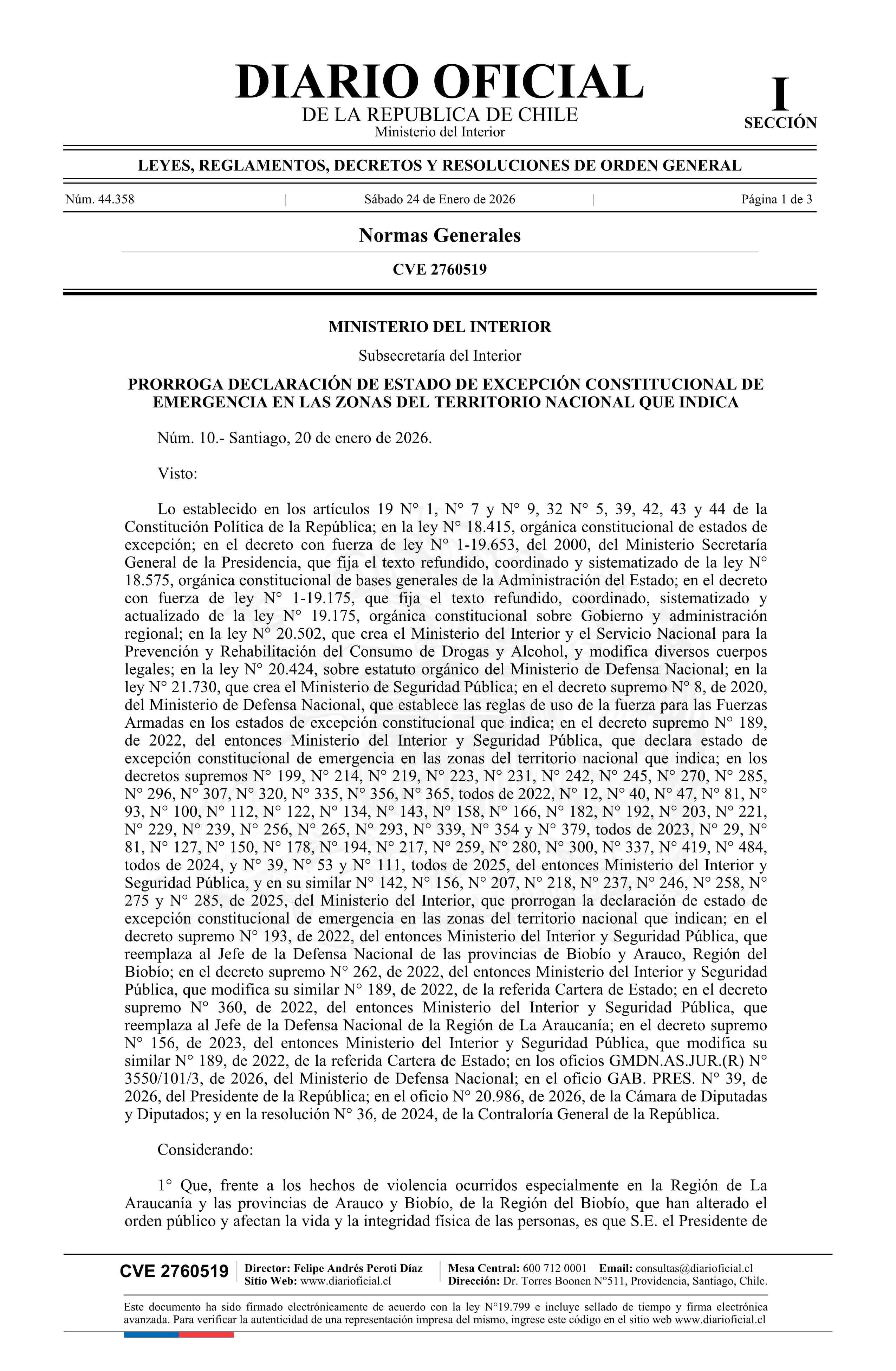 Decreto número 10, de 2026.- Prorroga declaración de estado de excepción constitucional de emergencia en las zonas del territorio nacional que indica