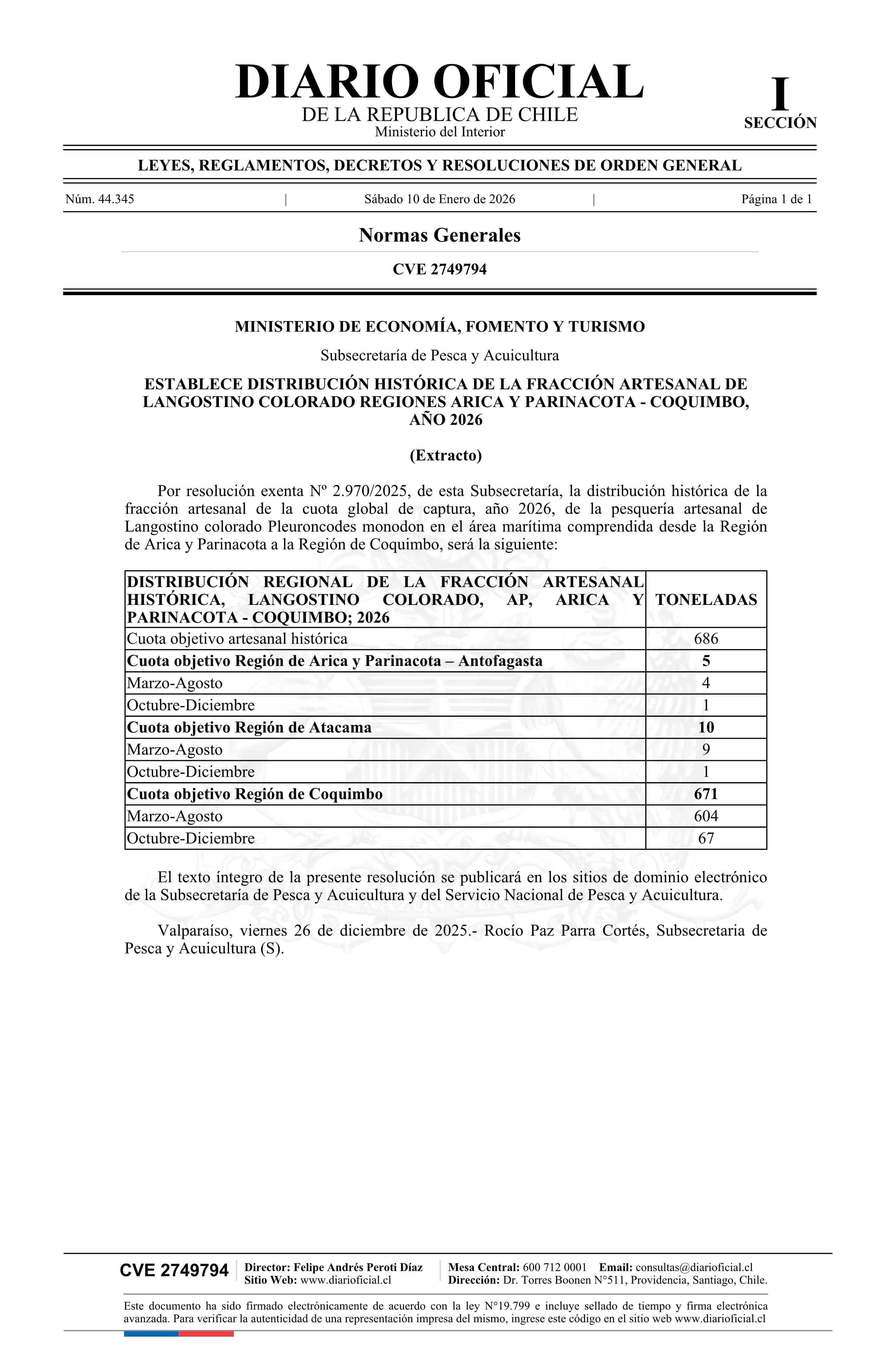 Extracto de resolución exenta número 2.970, de 2025.- Establece distribución histórica de la fracción artesanal de Langostino colorado regiones Arica y Parinacota - Coquimbo, año 2026 10-01-2026 Diario Oficial Edición Electrónica |