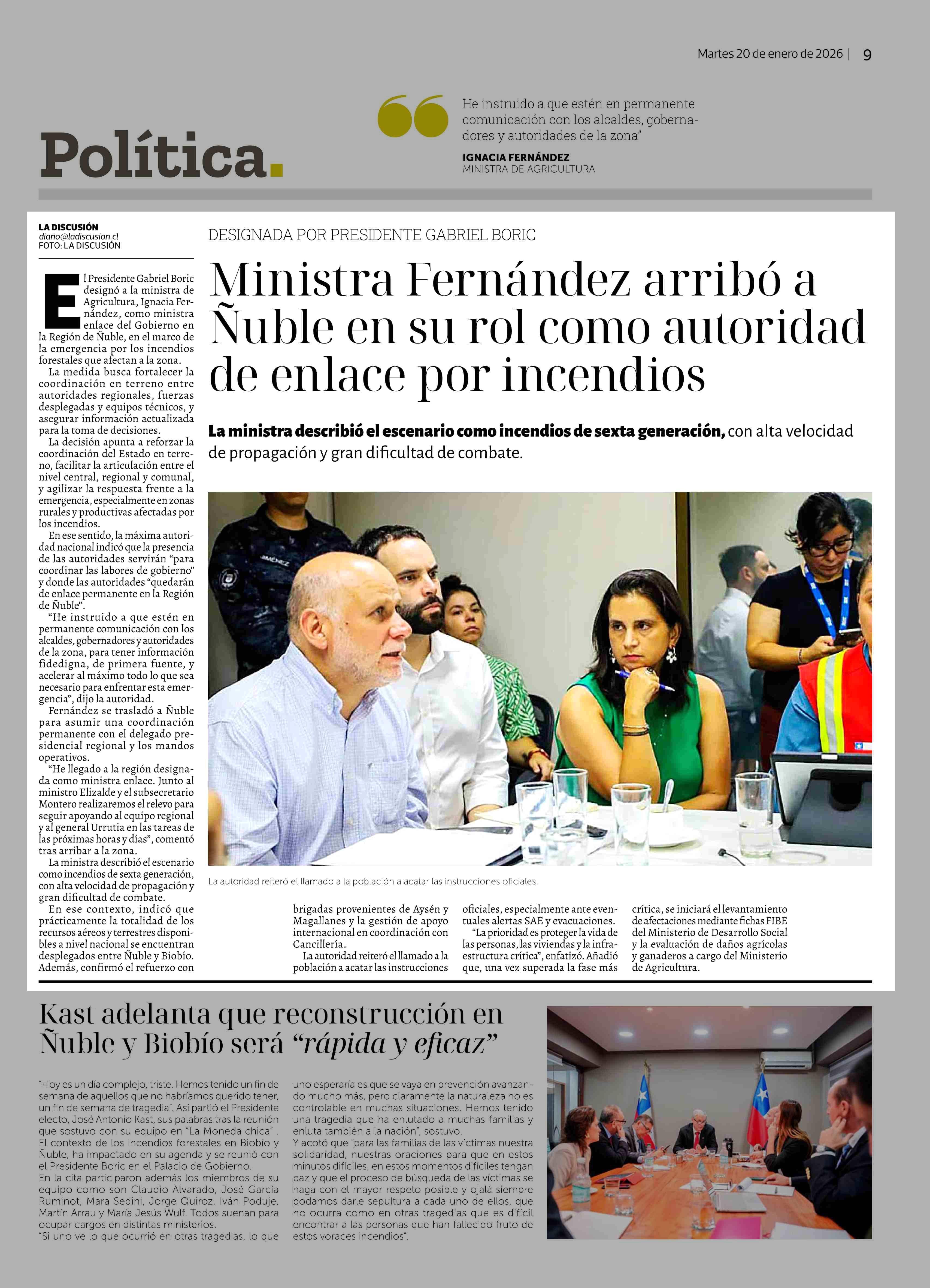 Ministra Fernández arribó a Ñuble en su rol como autoridad de enlace por incendios 20-01-2026 La Discusión |