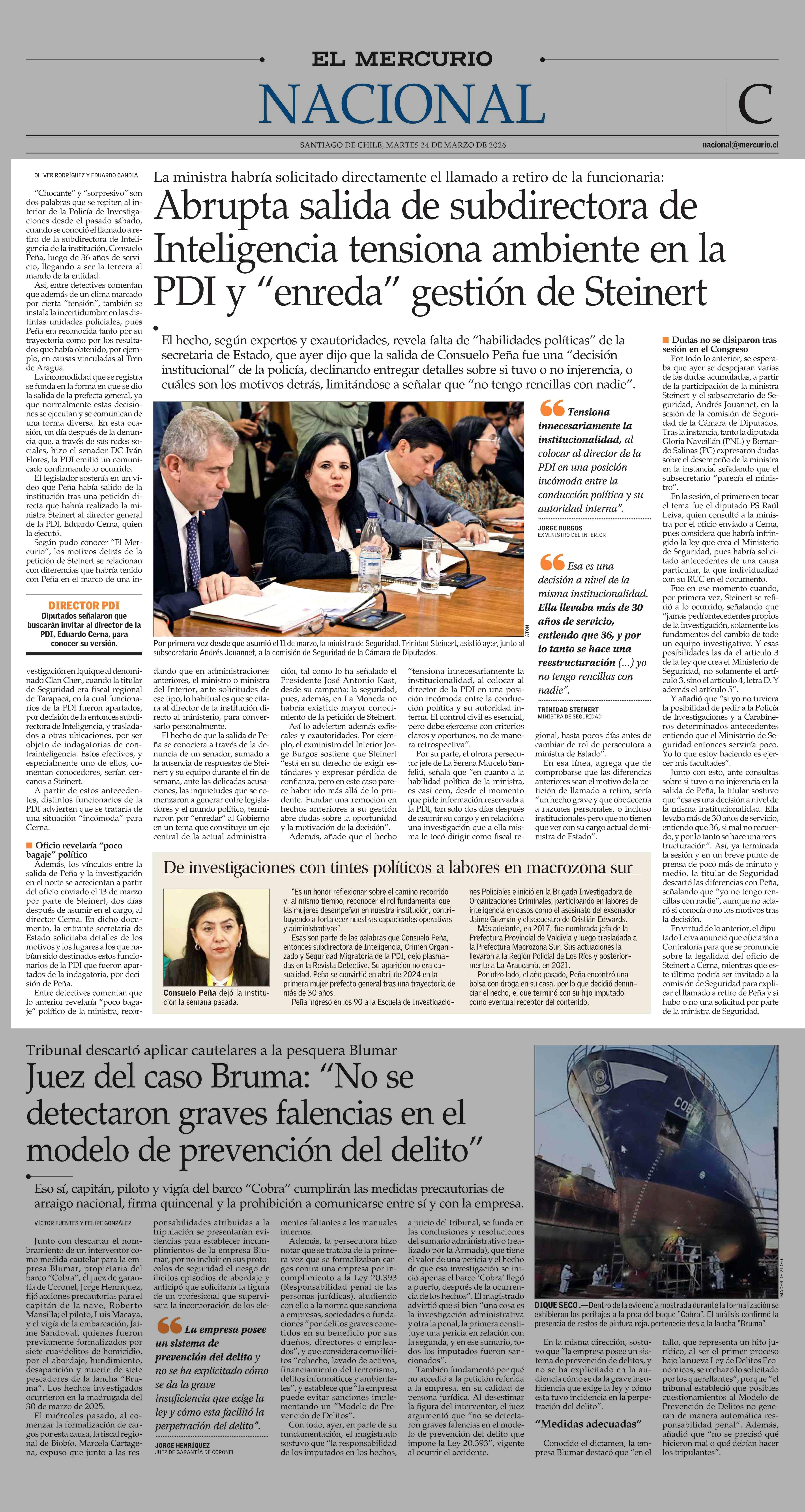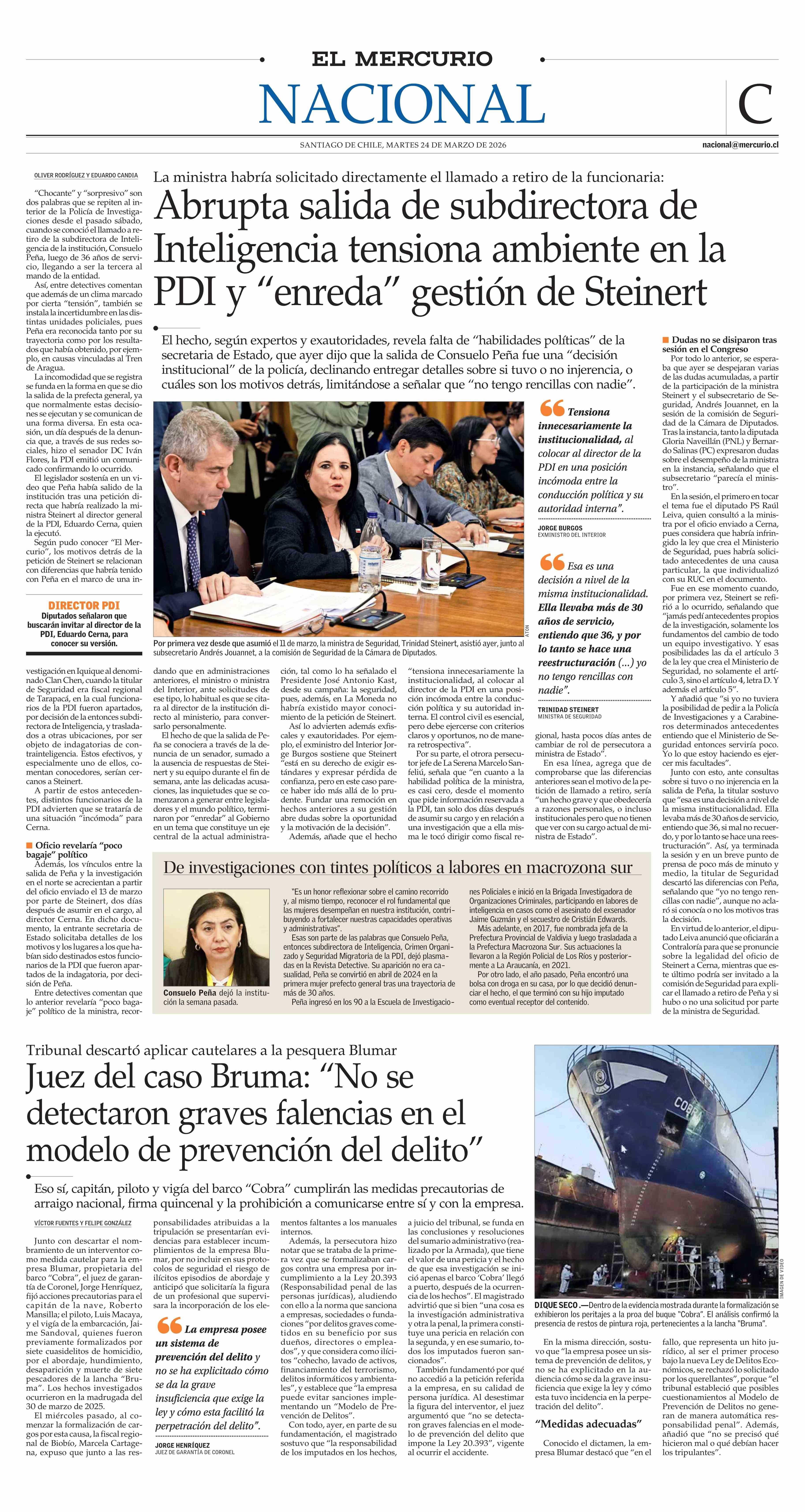 Abrupta salida de subdirectora de Inteligencia tensiona ambiente en la PDI y “enreda” gestión de Steinert 24-03-2026 El Mercurio |