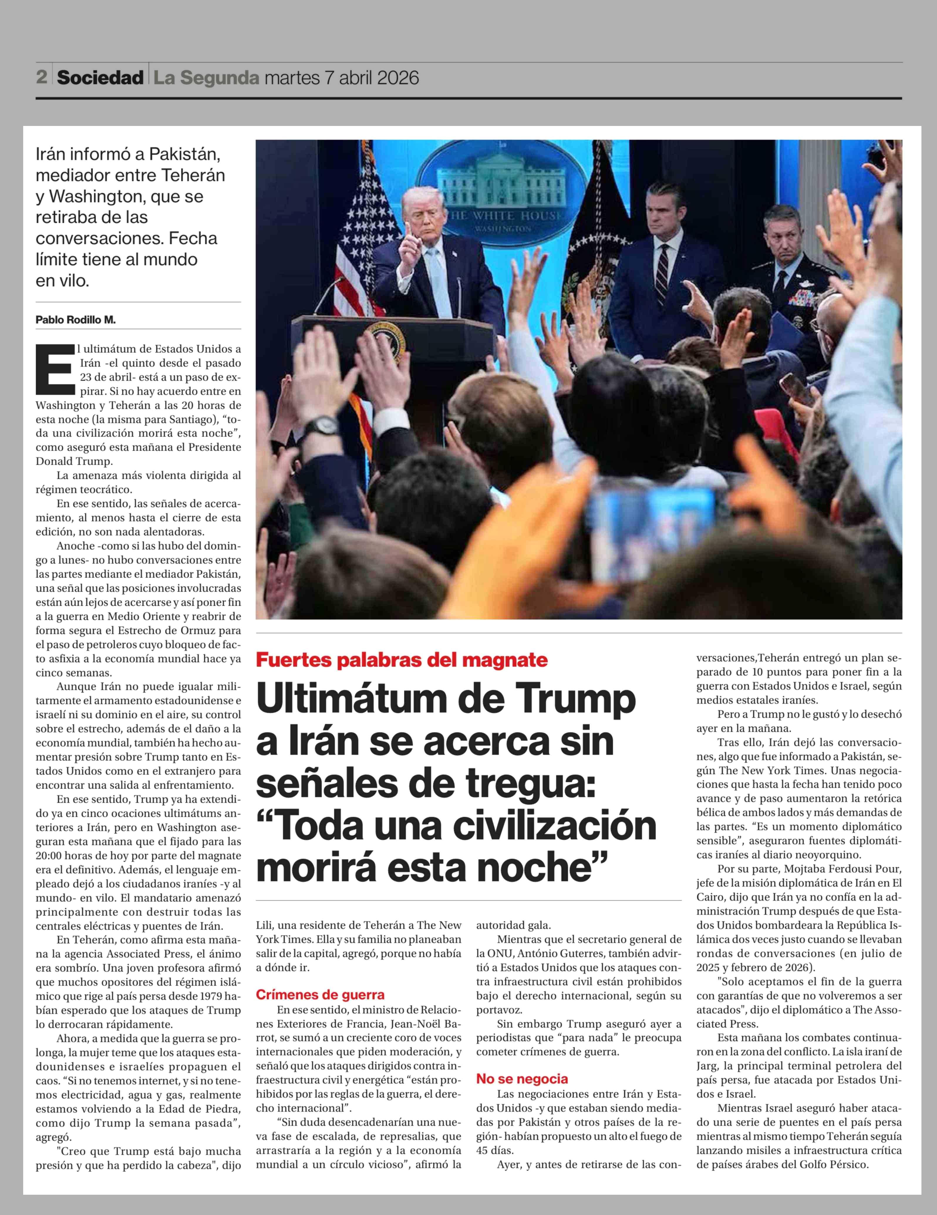 Título: Ultimátum de Trump a Irán se acerca sin señales de tregua: "Toda una civilización morirá esta noche"