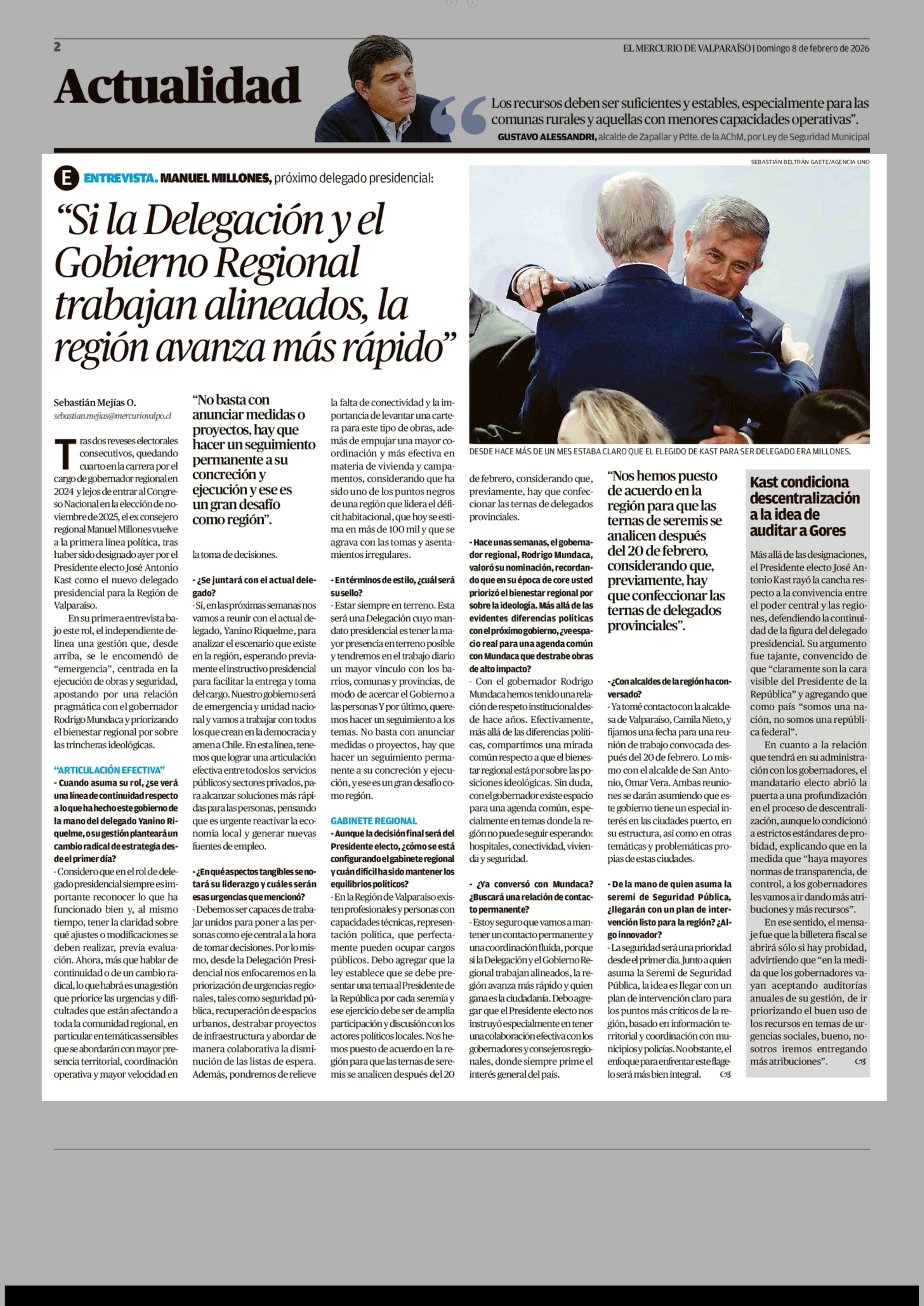 "Si la Delegación y el Gobierno Regional trabajan alineados, la región avanza más rápido" 08-02-2026 El Mercurio de Valparaíso |