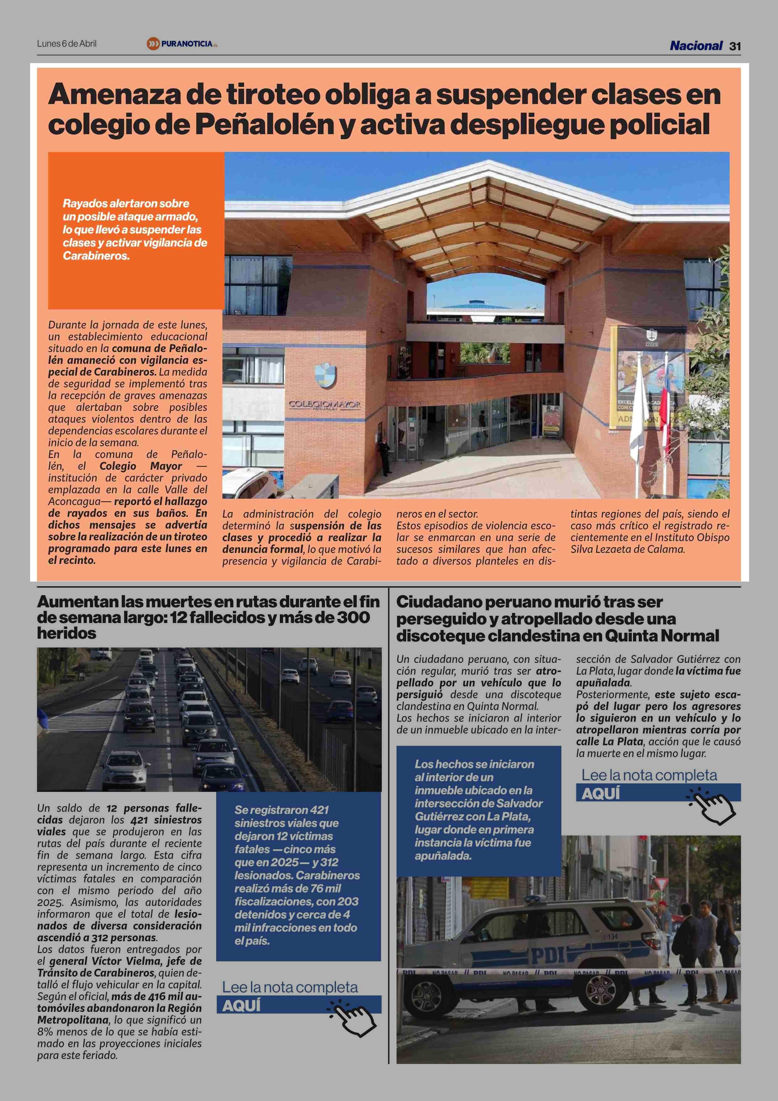 Amenaza de tiroteo obliga a suspender clases en colegio de Peñalolén y activa despliegue policial 06-04-2026 Puranoticia.cl |