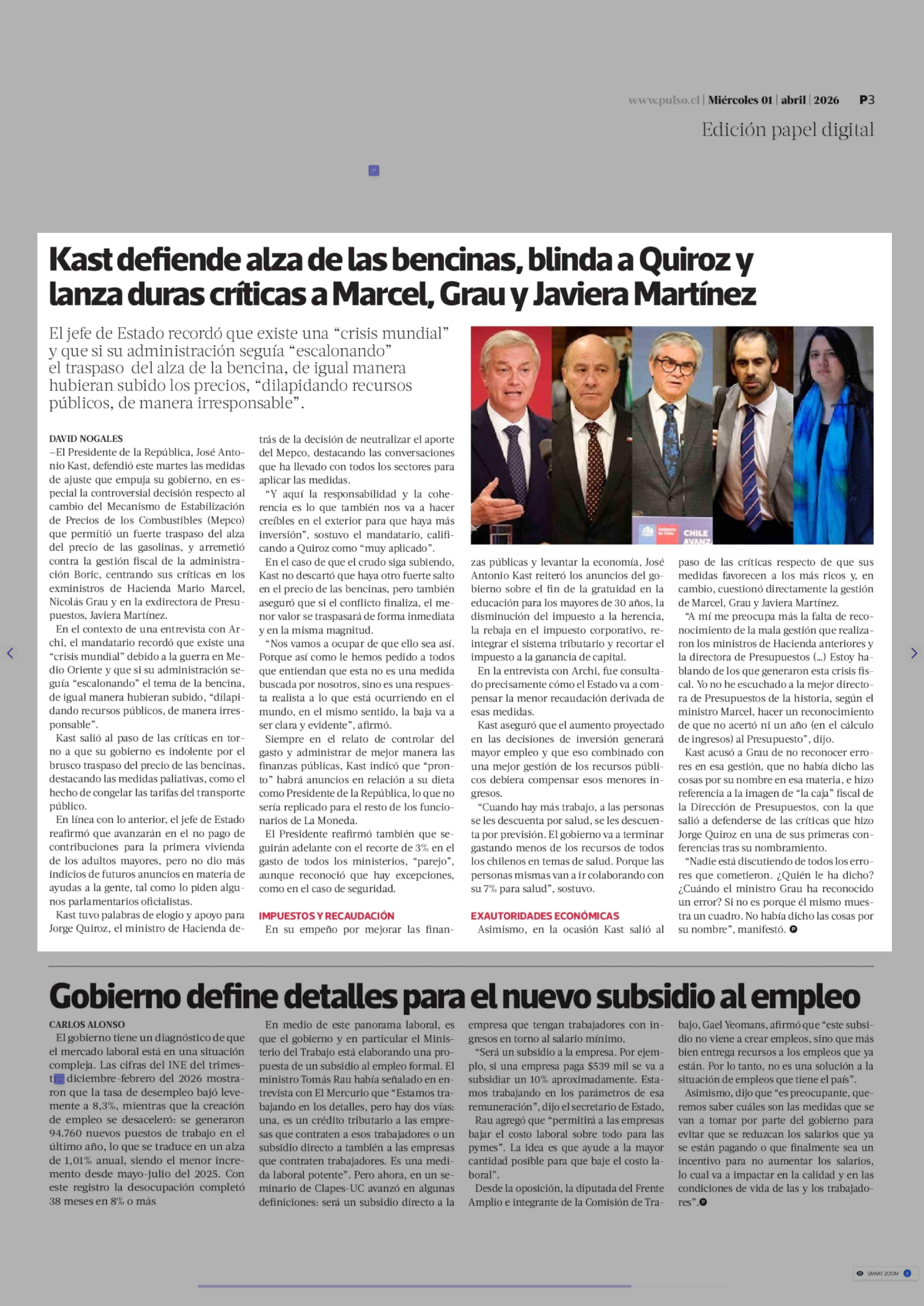 Kast defiende alza de las bencinas, blinda a Quiroz y lanza duras críticas a Marcel, Grau y Javiera Martínez 01-04-2026 La Tercera |