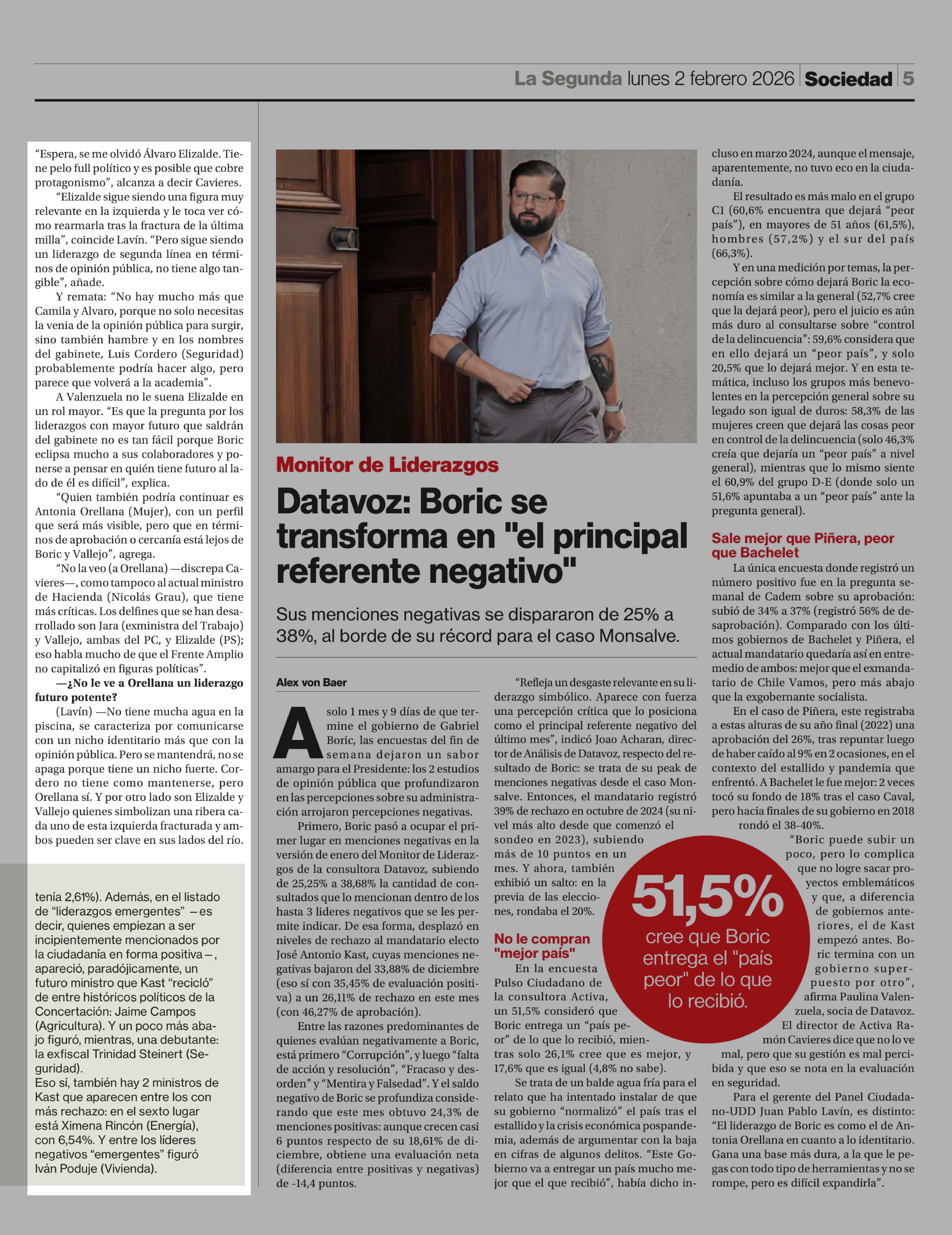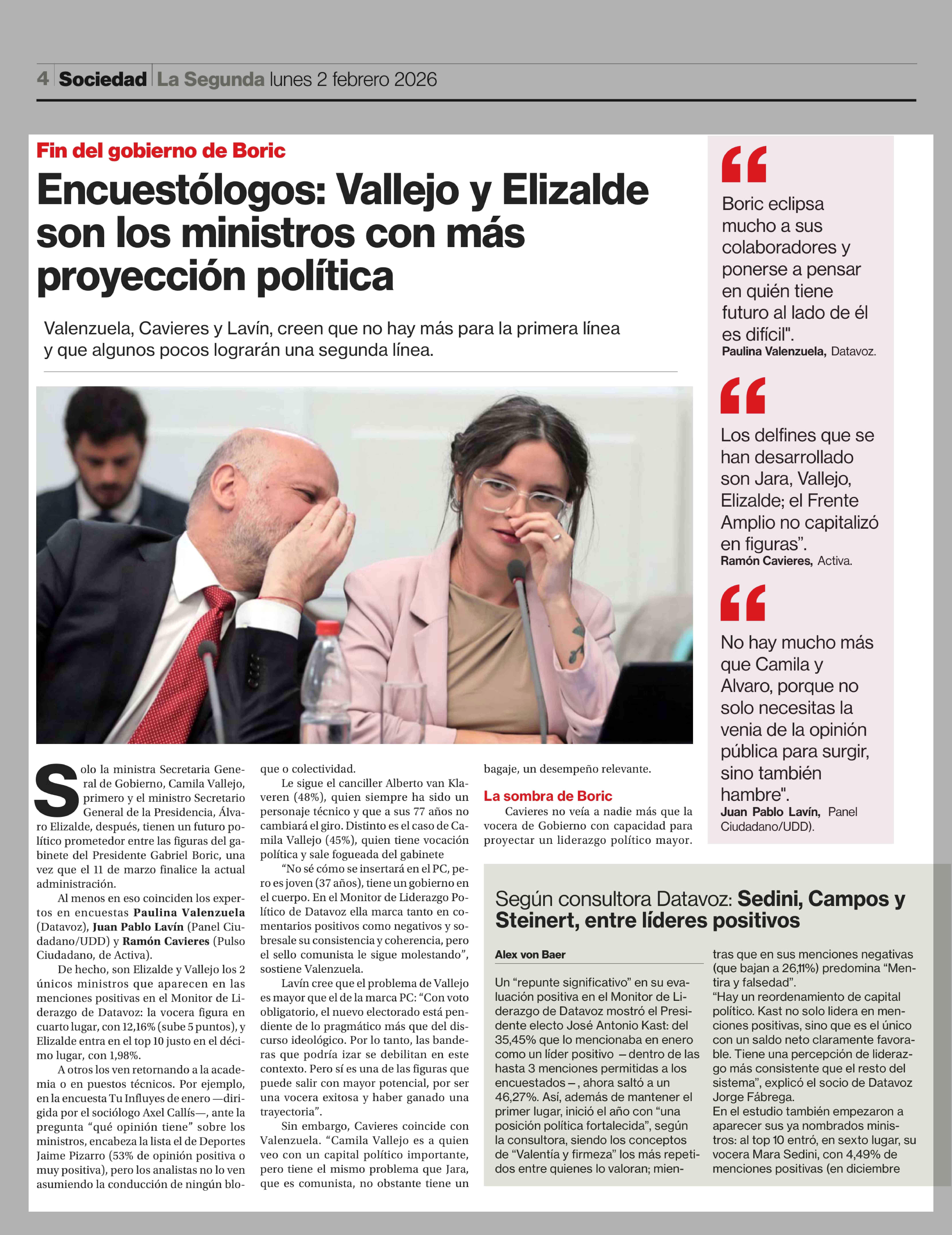 Encuestólogos: Vallejo y Elizalde son los ministros con más proyección política 02-02-2026 La Segunda |